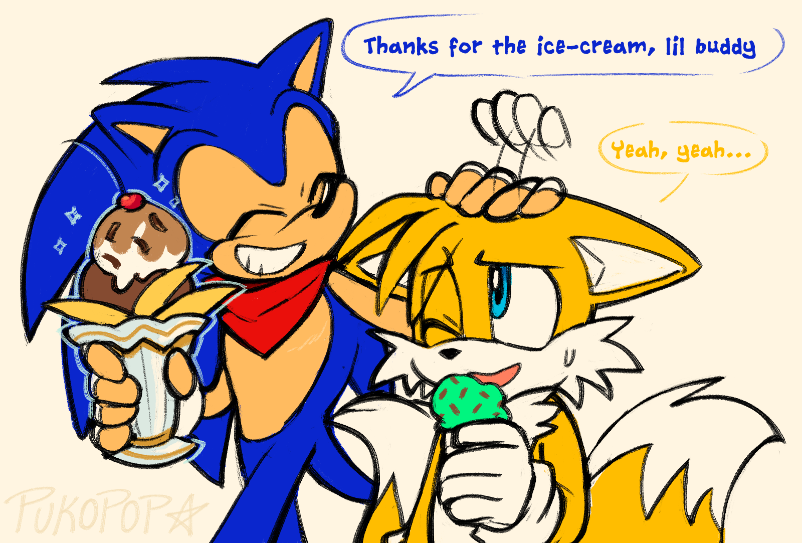 Been also in a big bro mood so I NEEDED to draw these two. Here's Sonic thanking Tails for getting him ice cream (which was pricey cuz LOOK AT THAT THING) heh.