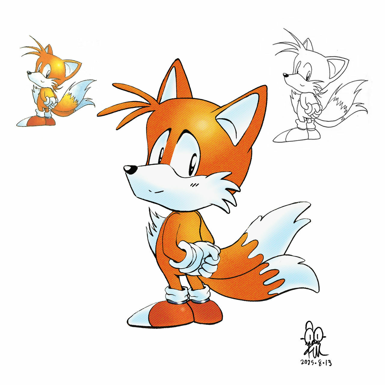 I did a second redraw with Tails holding his hands at the back of him. I wanted to give it a shot and it was fun. ☆:.。. o(≧▽≦)o .。.: