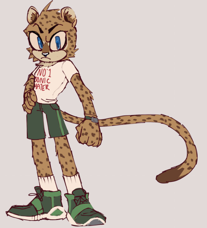 safe36090 artist:zeezu-ix4 oc2484 cheetah10 20232515 clenched fist674 clothes1586 ear fluff690 flat colors1228 frown4476 fully clothed186 fur markings178 grey background2311 hand on hip923 looking at viewer7840 male6203 oc only435 shirt706 shoelaces38 shoes1314 shorts572 simple background14622 sneakers96 socks857 solo16517 solo male406 watch7 words on a shirt49