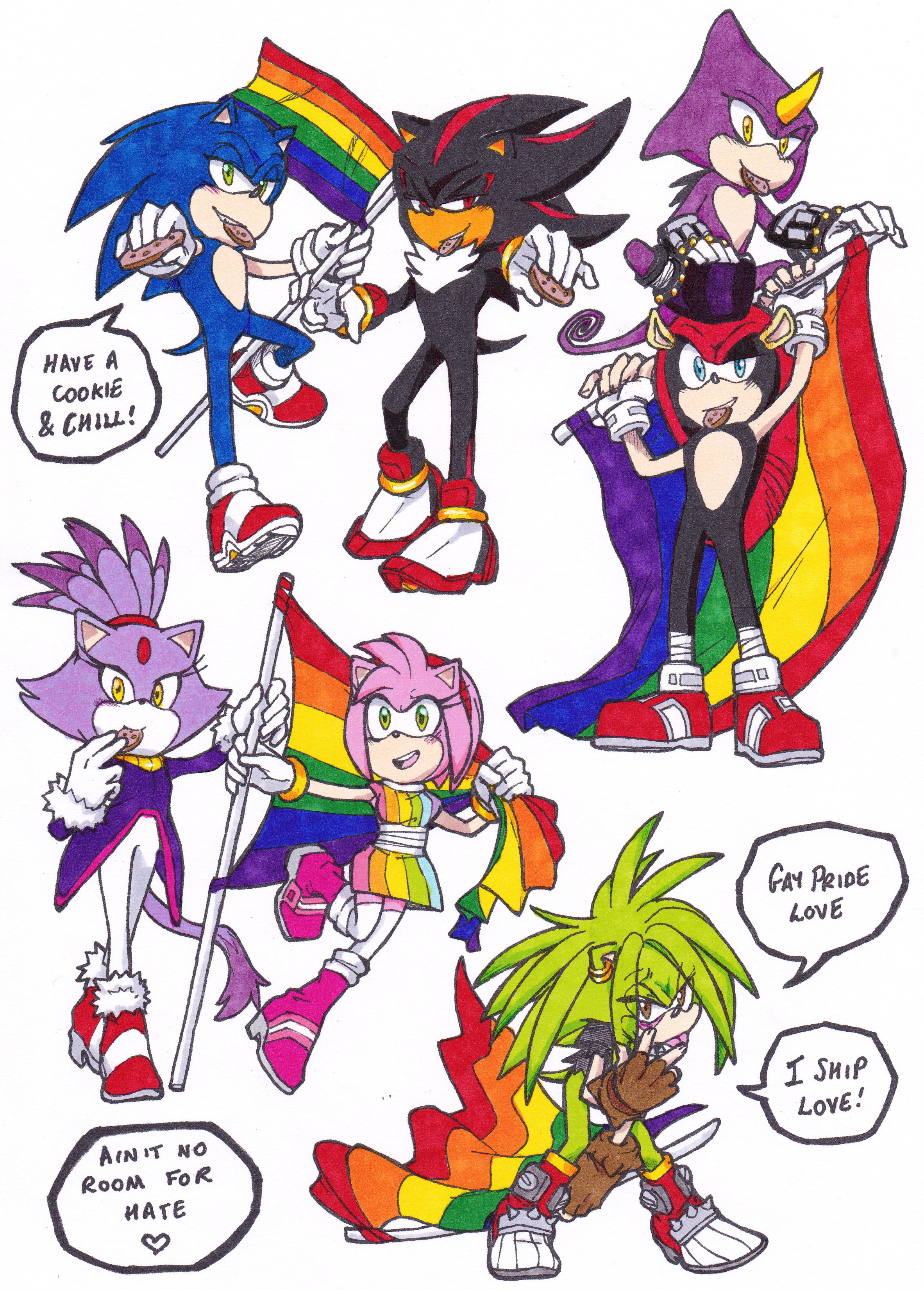 safe36682 artist:dawnhedgehog55514 amy rose5704 blaze the cat3572 espio the chameleon772 mighty the armadillo288 shadow the hedgehog6099 sonic the hedgehog13301 2016291 amy x blaze2373 cookie26 cookie in mouth3 dialogue2583 english text4177 espio x mighty10 food421 gay5093 gay pride249 group1332 heart3157 holding something3326 lesbian4006 looking at viewer7980 manic the hedgehog123 on head33 pride1347 pride flag747 shadow x sonic1739 shipping9696 simple background14937 smile13716 standing10511 talking184 talking to viewer87 text627 traditional media1555