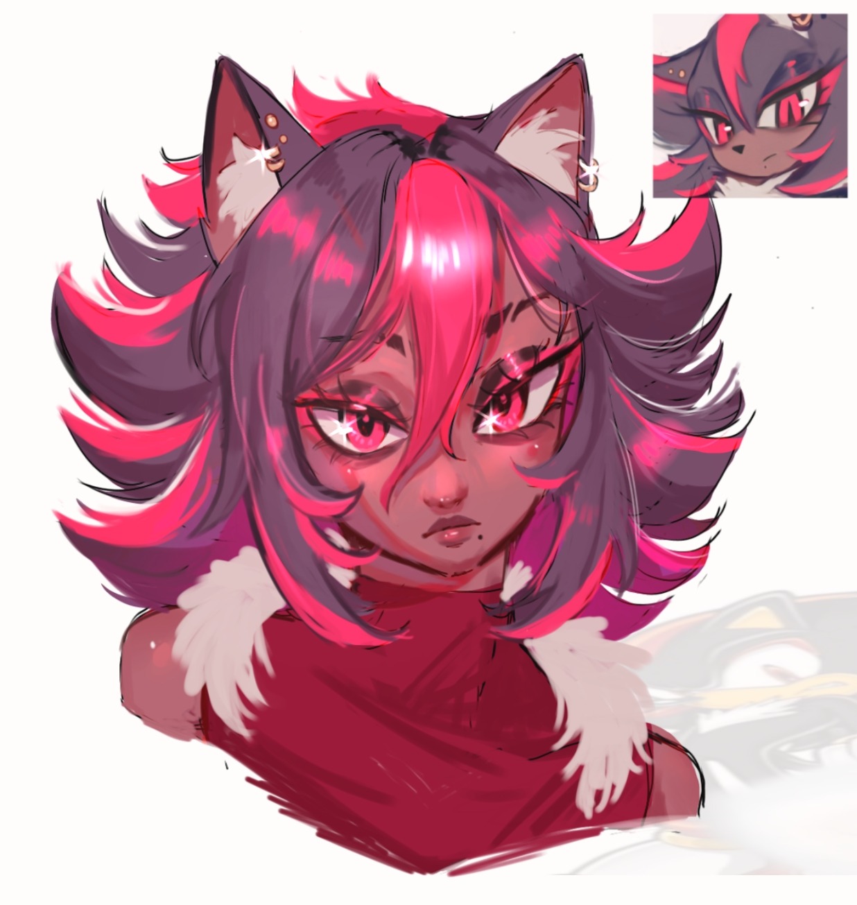 safe37270 artist:saintforan13 shadow the hedgehog6211 human2104 20253635 bust364 clothes1682 dark skin368 ear fluff727 ear piercing365 earring372 eyelashes1110 eyeshadow126 female6189 frown4621 gender swap957 humanized754 lineless533 looking offscreen4304 partially humanized278 reference inset508 scarf537 simple background15309 solo17008 species swap219