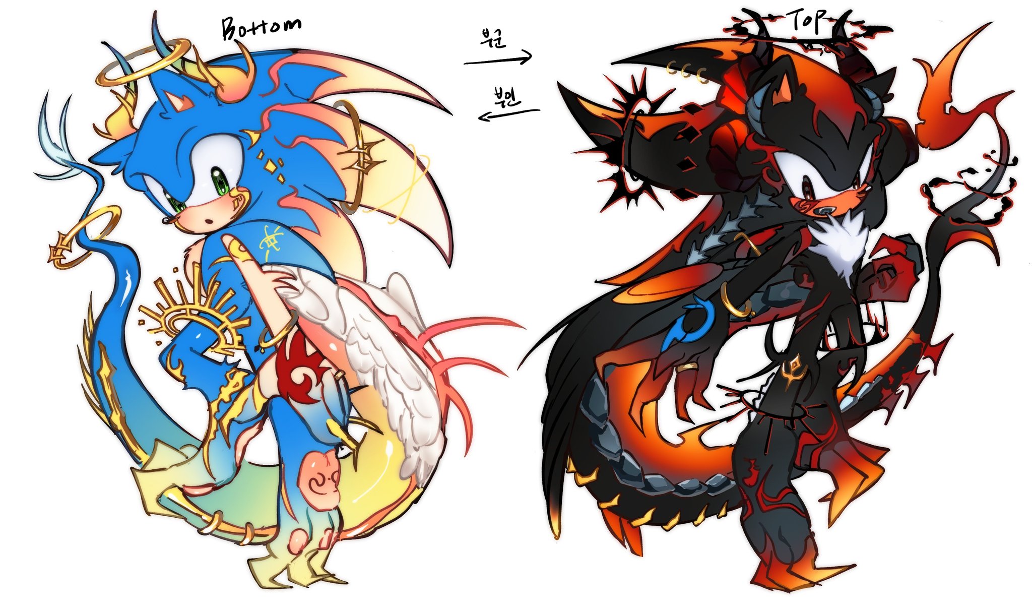 safe37787 artist:tamjeong_sonic353 shadow the hedgehog6372 sonic the hedgehog13789 20253816 alternate universe875 arrow38 duo12535 english text4341 gay5210 halo31 horns22 korean text280 shadow x sonic1784 shadow's logo64 shipping10008 simple background15608 white background7687 wings131