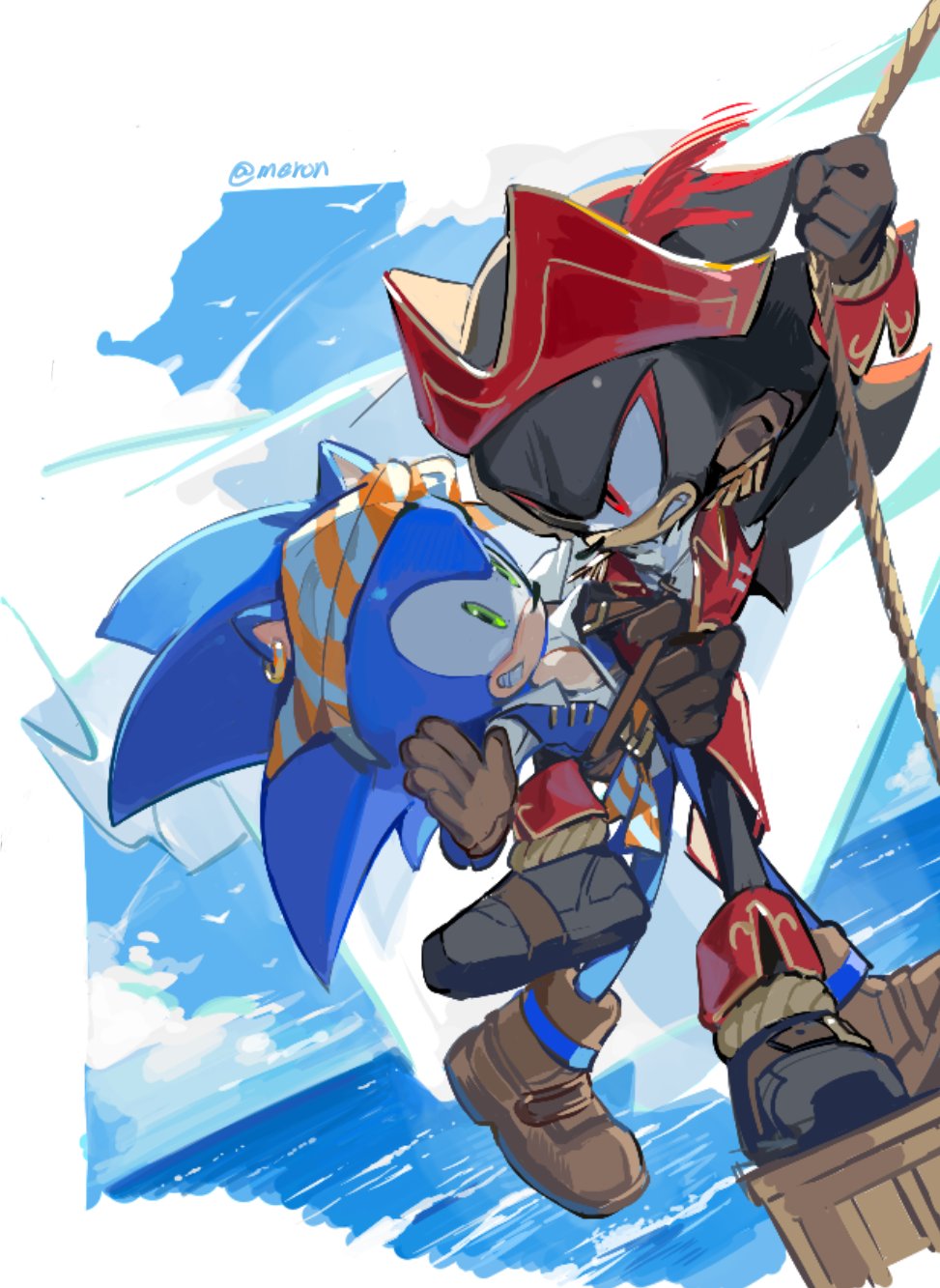 safe38074 artist:bb_meronpan60 shadow the hedgehog6454 sonic the hedgehog13958 20253949 alternate outfit1277 clenched teeth1895 clouds945 daytime937 duo12690 earring377 gay5243 grin481 hat463 holding something3652 looking at each other2782 looking at them2255 outdoors1652 pirate outfit32 rope45 shadow x sonic1819 shipping10099 smile14407 water481