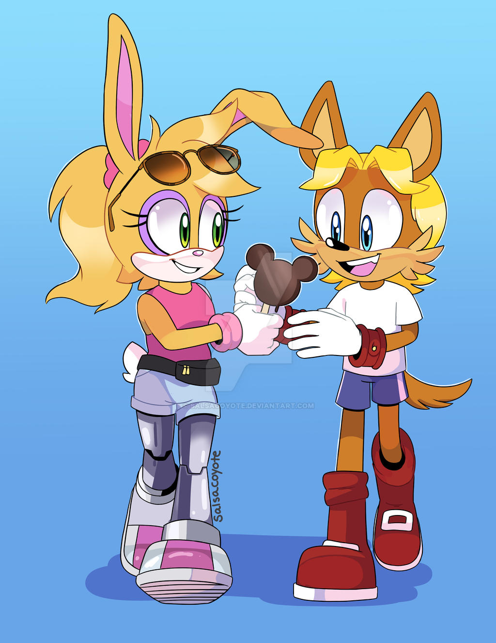 safe38182 artist:salsacoyote24 antoine d'coolette182 bunnie rabbot317 coyote97 rabbit612 clothes1824 cybernetic18 duo12756 female6686 food495 fully clothed244 glasses454 gradient background1574 grin493 holding something3699 ice cream121 male6937 mouth open5910 obtrusive watermark194 open smile978 shirt776 shorts603 simple background15834 smile14462 watermark573