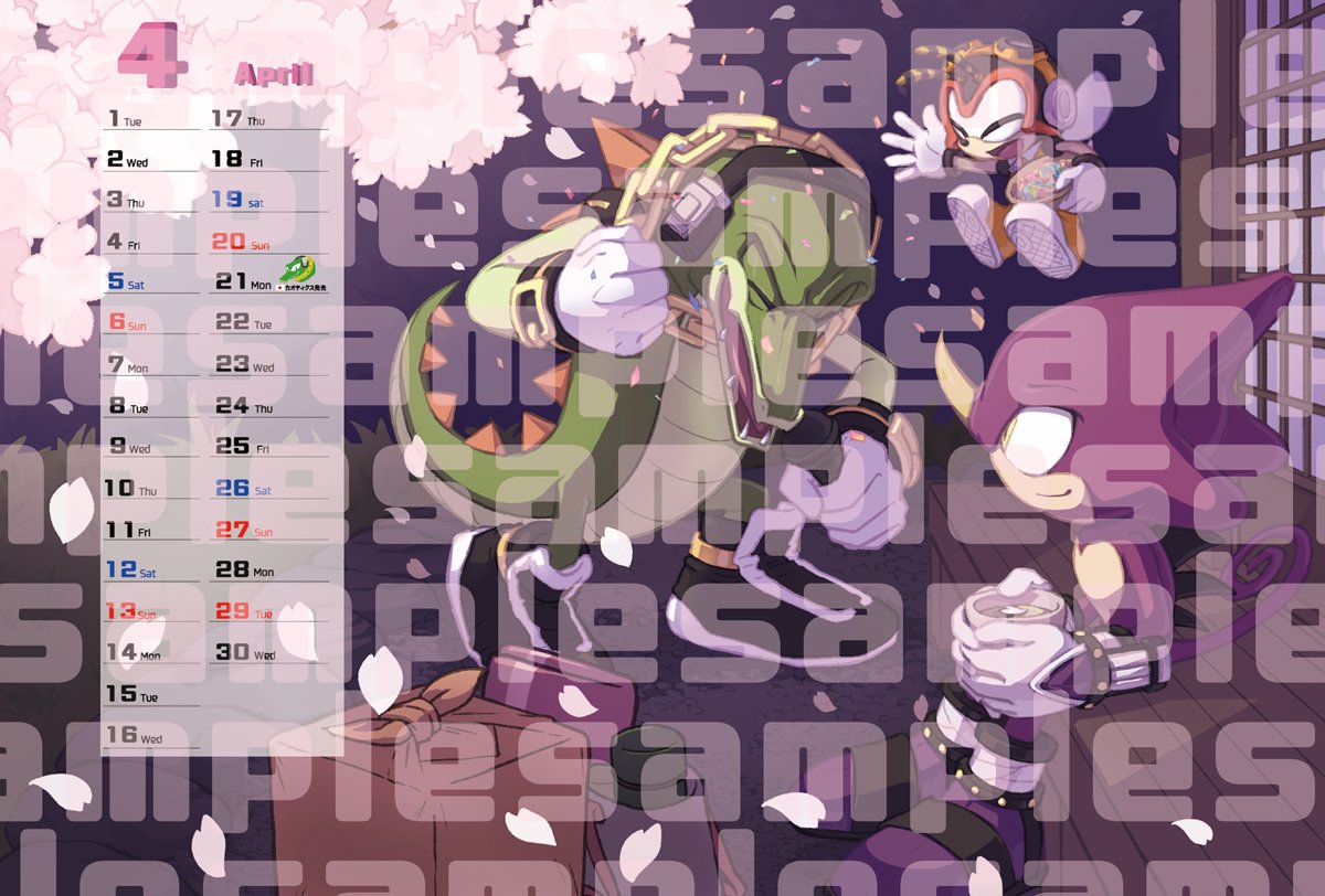 safe38240 artist:apiakus1 charmy bee473 espio the chameleon792 vector the crocodile300 series:sonic fan calendar 202513 20244513 cherry blossom petals23 cherry blossom tree20 confetti40 cup83 eyes closed4814 holding something3708 indoors421 looking at them2272 mouth open5923 obtrusive watermark207 sitting2419 smile14495 standing11110 team chaotix103 tree455 trio1834 watermark586