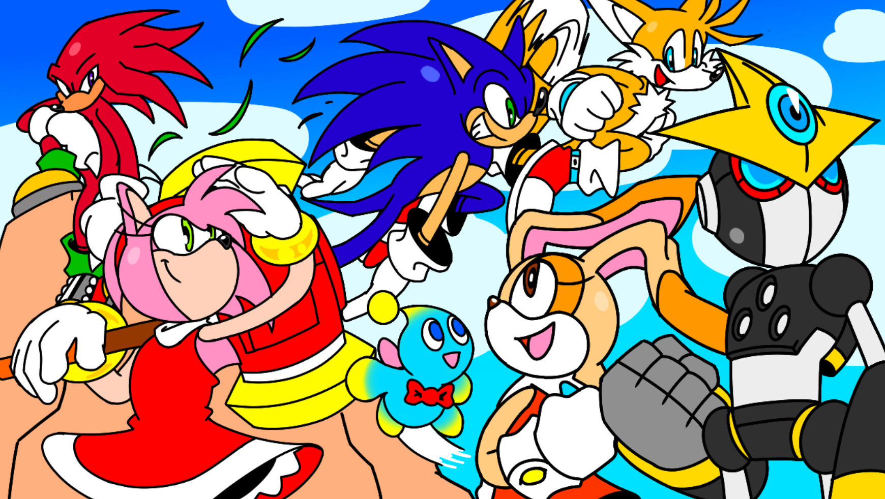 safe38912 artist:calebartboy1516 amy rose5949 cheese (chao)389 cream the rabbit1116 gemerl27 knuckles the echidna2392 miles "tails" prower9501 sonic the hedgehog14308 chao789 20254130 clouds996 flying1310 frown4883 grass blade7 group1454 holding something3852 looking at them2329 looking at viewer8746 mid-air849 neutral chao387 piko piko hammer511 robot1113 sky background21 smile14939 sonic advance 326 spinning tails401 standing11343 team sonic391