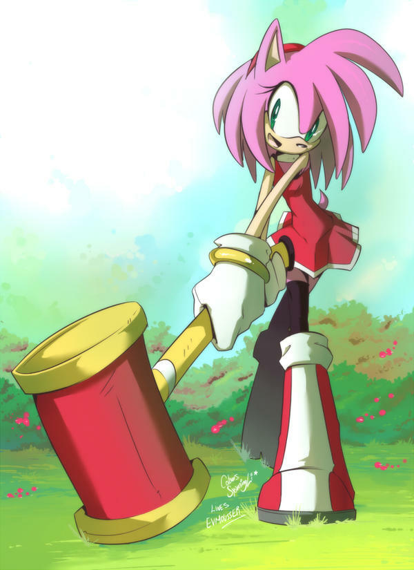 safe39540 artist:evmousser45 artist:syaming-li1 amy rose6025 hedgehog8220 2010190 collaboration31 daytime1080 eyelashes1253 female7278 flower712 grass858 holding something4053 looking at viewer9090 mouth open6440 outdoors1855 piko piko hammer517 smile15508 solo18258 standing11589 stockings135