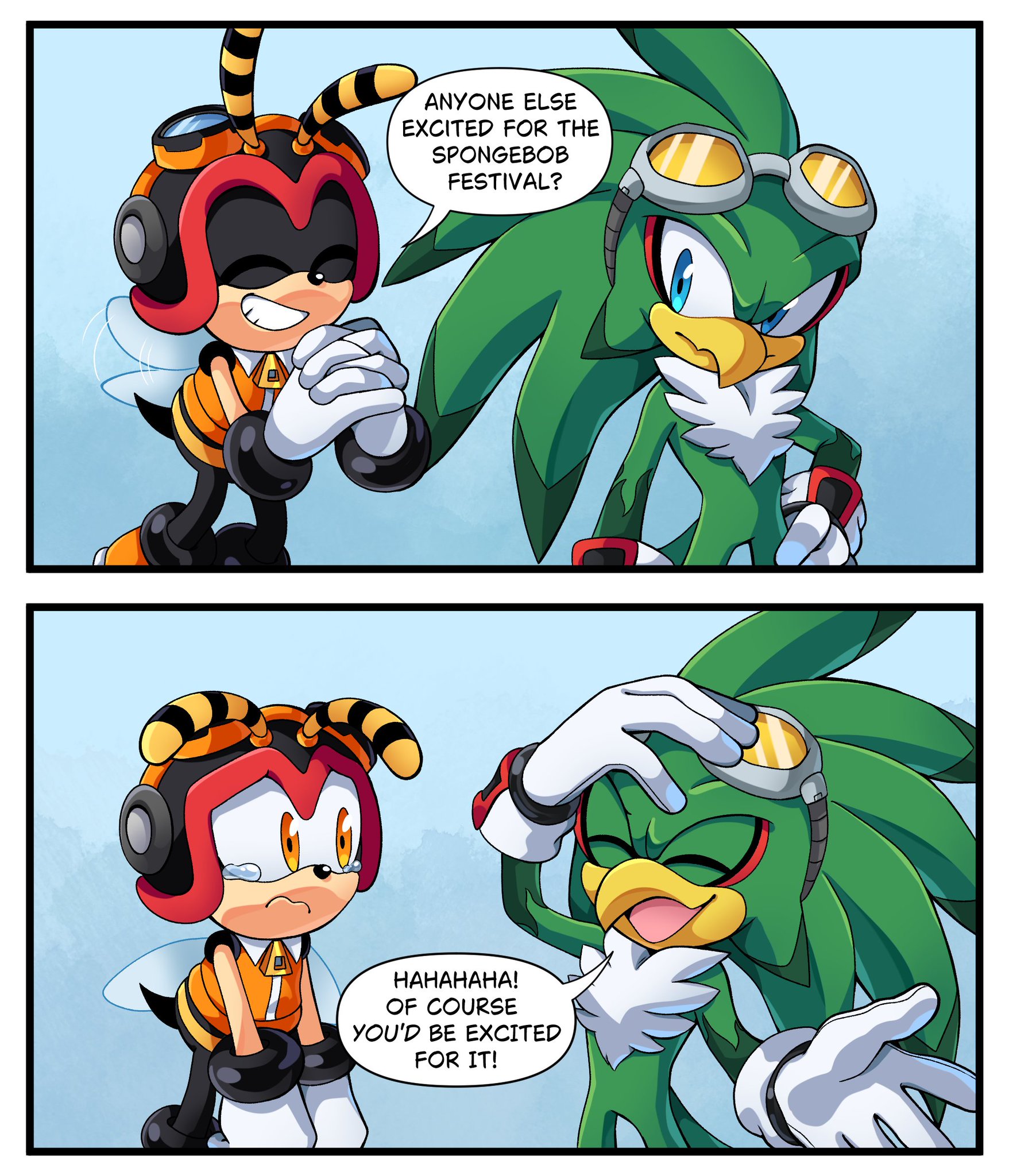 safe40772 artist:skywayski2 charmy bee503 jet the hawk355 20261193 border648 comic917 crying699 dialogue3052 duo14308 english text4994 excited18 eyes closed5275 flapping wings80 flying1403 frown5363 gradient background1977 hands together261 happy342 looking at each other3123 looking at them2549 mid-air972 sad301 smile16567 speech bubble1894 spongebob squarepants16 standing12073 talking301 tears625 text1279
