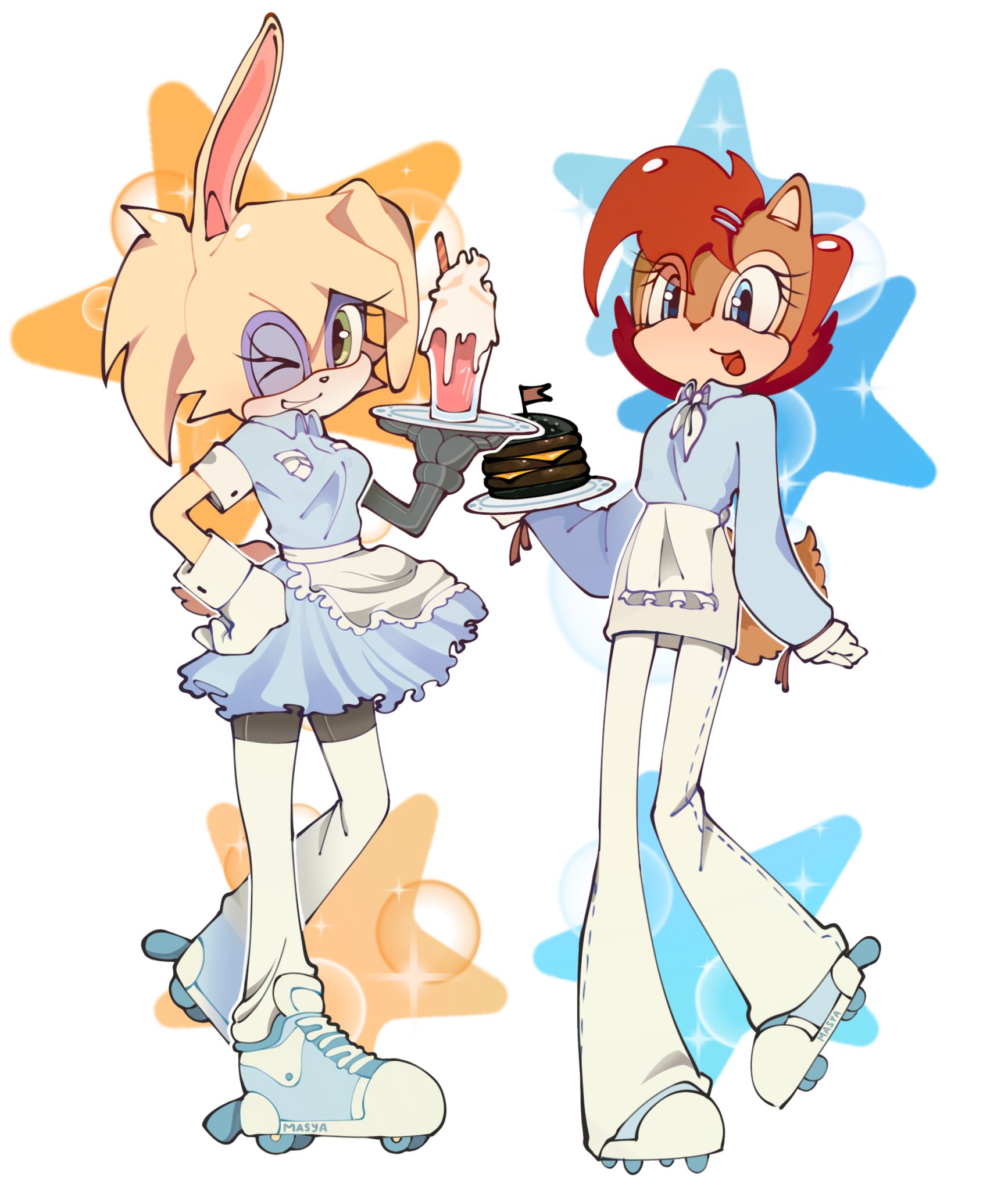 safe40936 artist:mas9lm2 bunnie rabbot365 sally acorn1976 chipmunk1405 rabbit803 20261221 abstract background7696 bubbles51 burger29 clothes2272 cybernetic35 dress1001 drink194 drinking glasses10 duo14401 eye clipping through hair617 female8028 food608 fully clothed338 holding something4511 looking at viewer9873 mouth open6959 open smile1613 plate78 rollerskates35 smile16654 smiling at viewer1857 sparkles1150 star (symbol)839 waitress6 wink1334 winking at viewer131