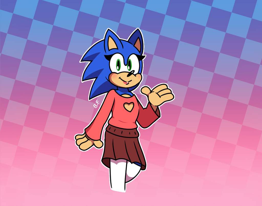 safe34621 artist:bella the artist!1 sonic the hedgehog12339 hedgehog6641 checkered background108 eyelashes947 female5660 gloves off376 looking at viewer7399 outline1675 signature5737 skirt455 smile12698 solo15557 standing9794 stockings118 sweater229 trans female709 transgender1588