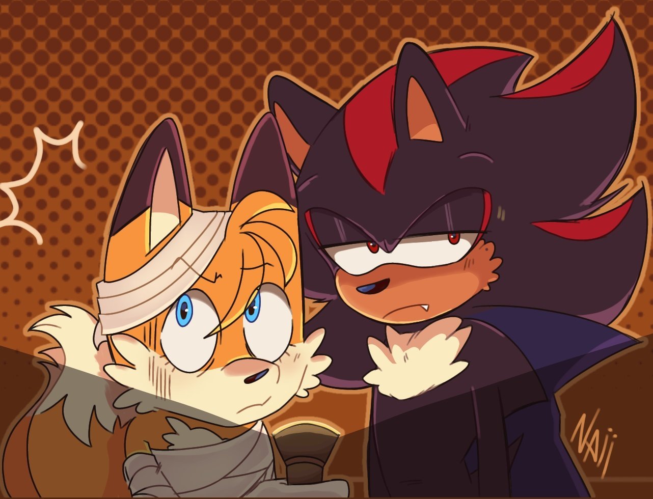 safe34608 artist:iluskonai9 miles "tails" prower8717 shadow the hedgehog5648 20244206 abstract background6747 bandage125 cape298 flashlight11 frown4255 gay4893 halloween82 holding something3003 looking at viewer7393 one fang1228 outline1675 shadow x tails212 shipping9210 signature5734