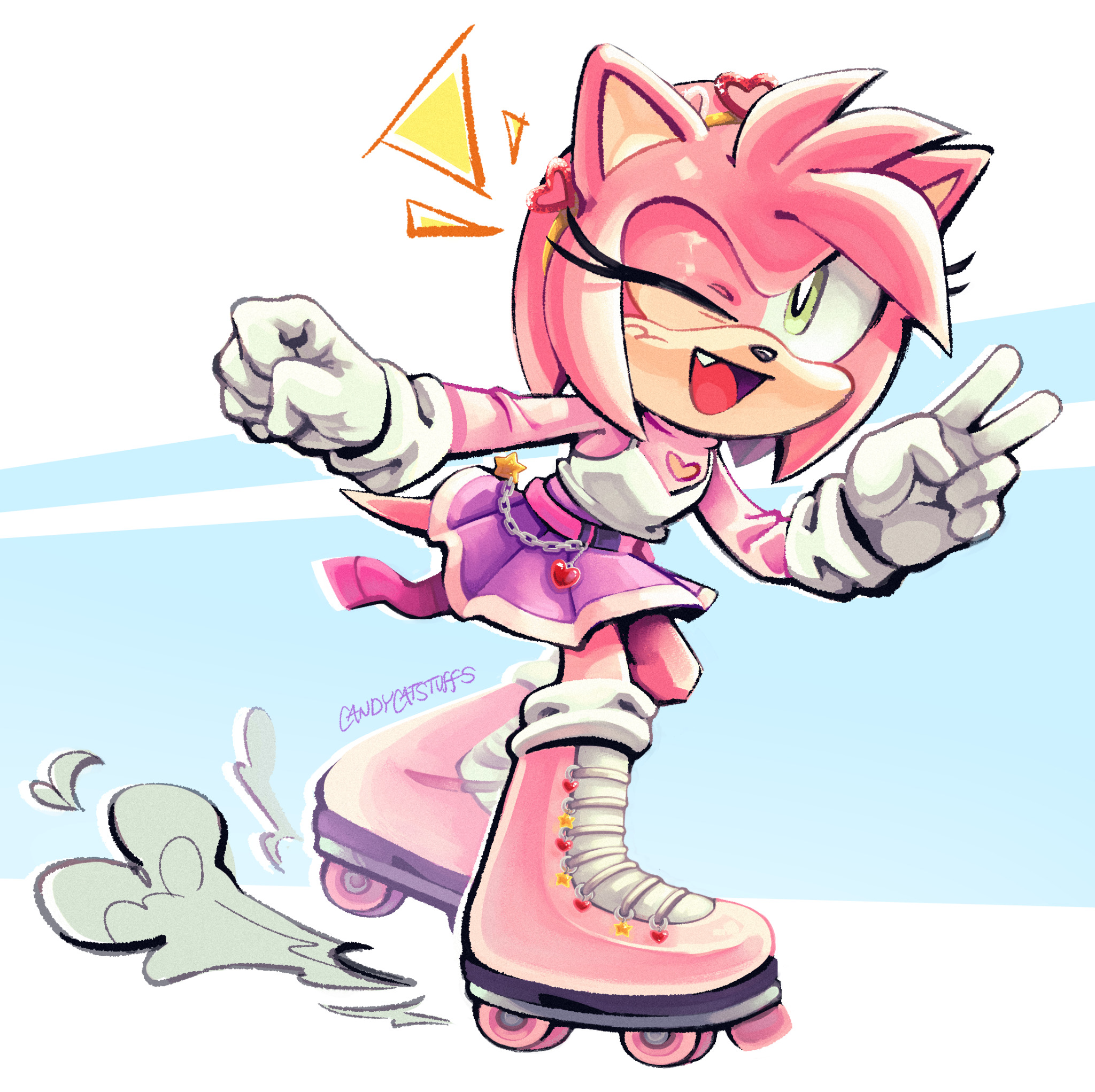 safe34979 artist:candycatstuffs59 amy rose5562 hedgehog6683 20252565 abstract background6828 alternate outfit966 chain64 clothes1445 crop top229 dust clouds91 female5711 looking at viewer7503 mouth open5307 one fang1246 open smile739 rollerskates28 signature5809 skating55 skirt461 smile12898 solo15779 v sign980 wink1088