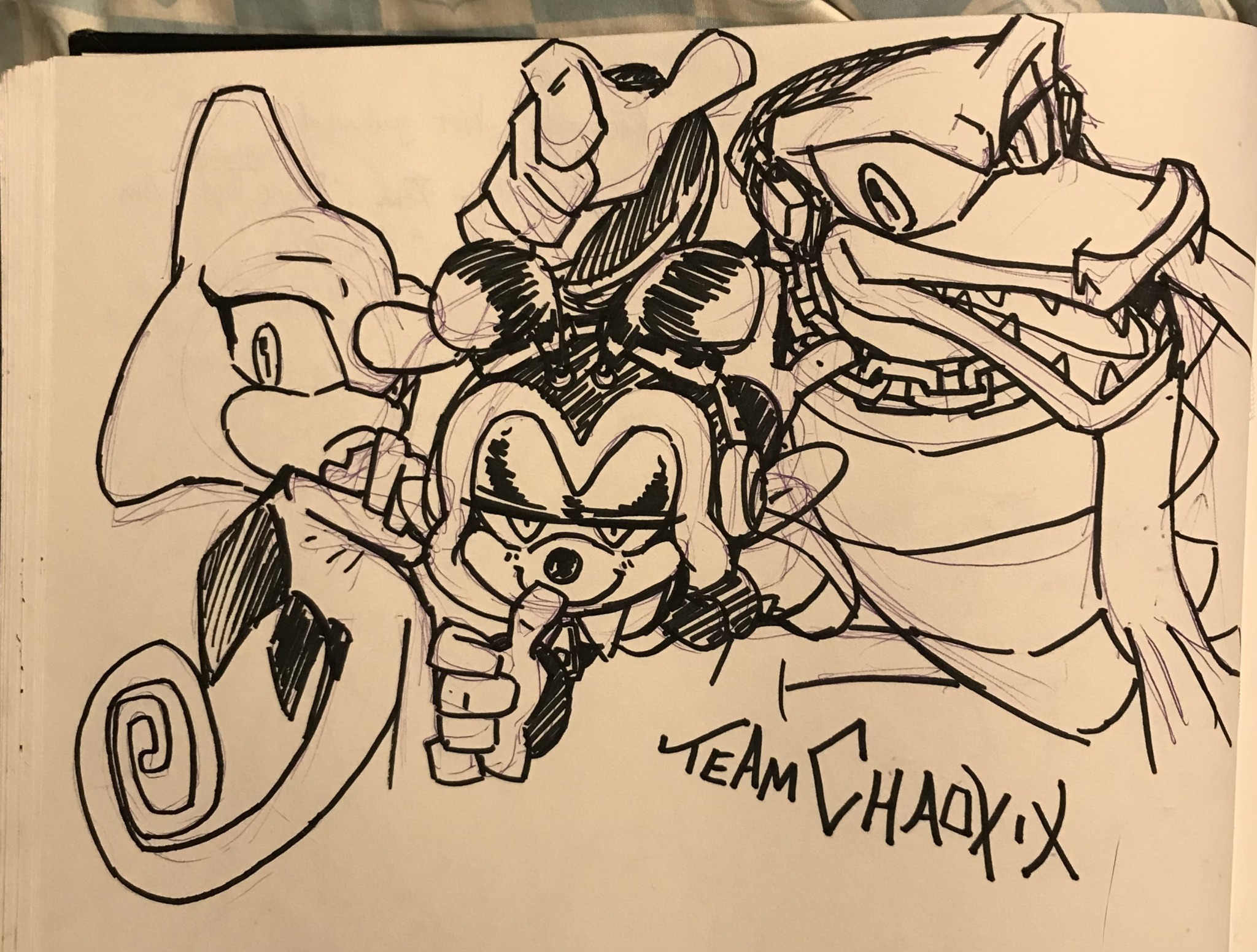 safe35037 artist:montydrswsstuff12 charmy bee448 espio the chameleon745 vector the crocodile279 20252597 arms folded564 flying1200 frown4334 lidded eyes3715 line art1513 looking at viewer7519 mid-air704 monochrome1827 penwork23 smile12932 standing9962 team chaotix92 text495 thumbs up357 traditional media1513 trio1618