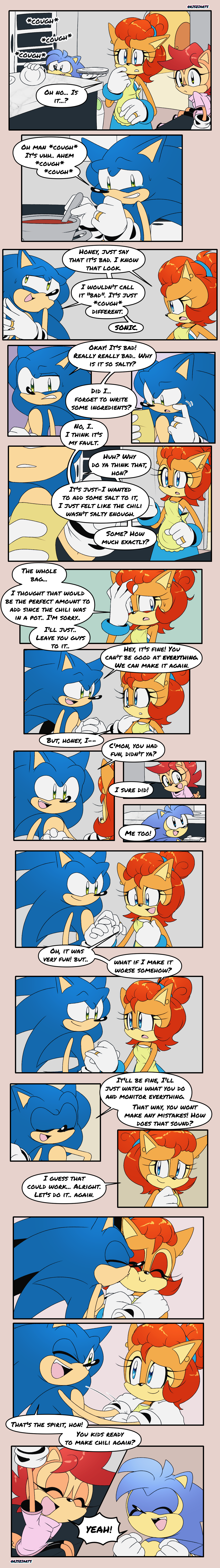 safe35221 artist:risziarts89 manik acorn28 sally acorn1139 sonia acorn26 sonic the hedgehog12547 chipmunk440 hedgehog6753 20232447 child364 chili2 comic632 cooking17 dialogue2503 english text4011 family69 king sonic21 kiss989 kiss on cheek402 kitchen11 plate58 quartet66 queen sally acorn13 sally x sonic193 shipping9345 speech bubble1261 straight1132