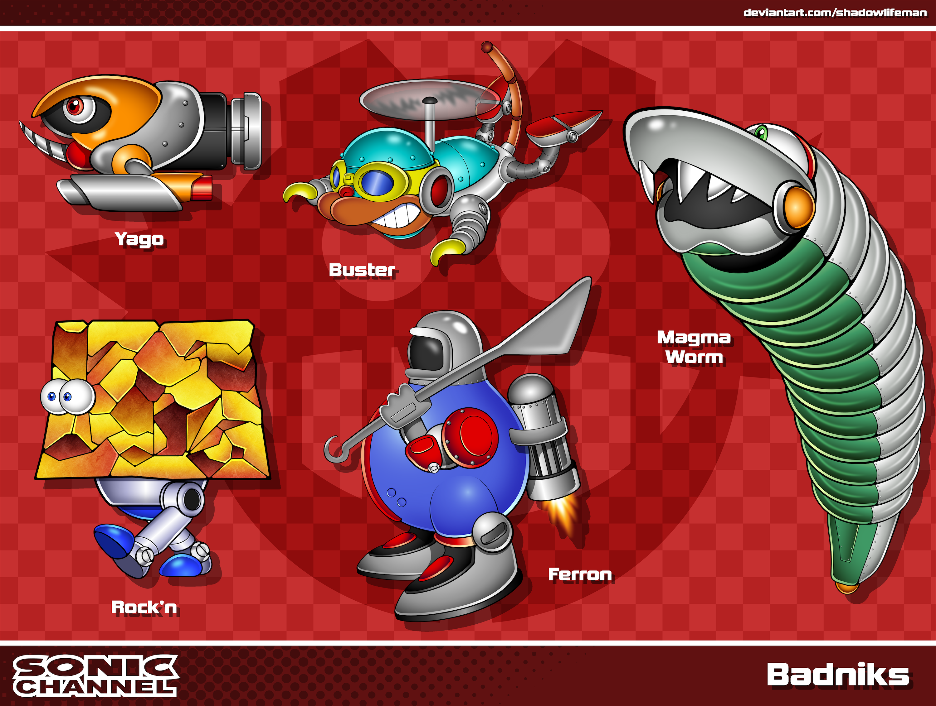 safe36284 artist:shadowlifeman33 20221371 agender250 agender only22 badnik96 buster1 character name974 checkered background118 eggman empire logo40 ferron1 group1310 looking offscreen4196 magma worm1 robot983 rock'n1 sonic channel style14 style emulation198 text607 yago1
