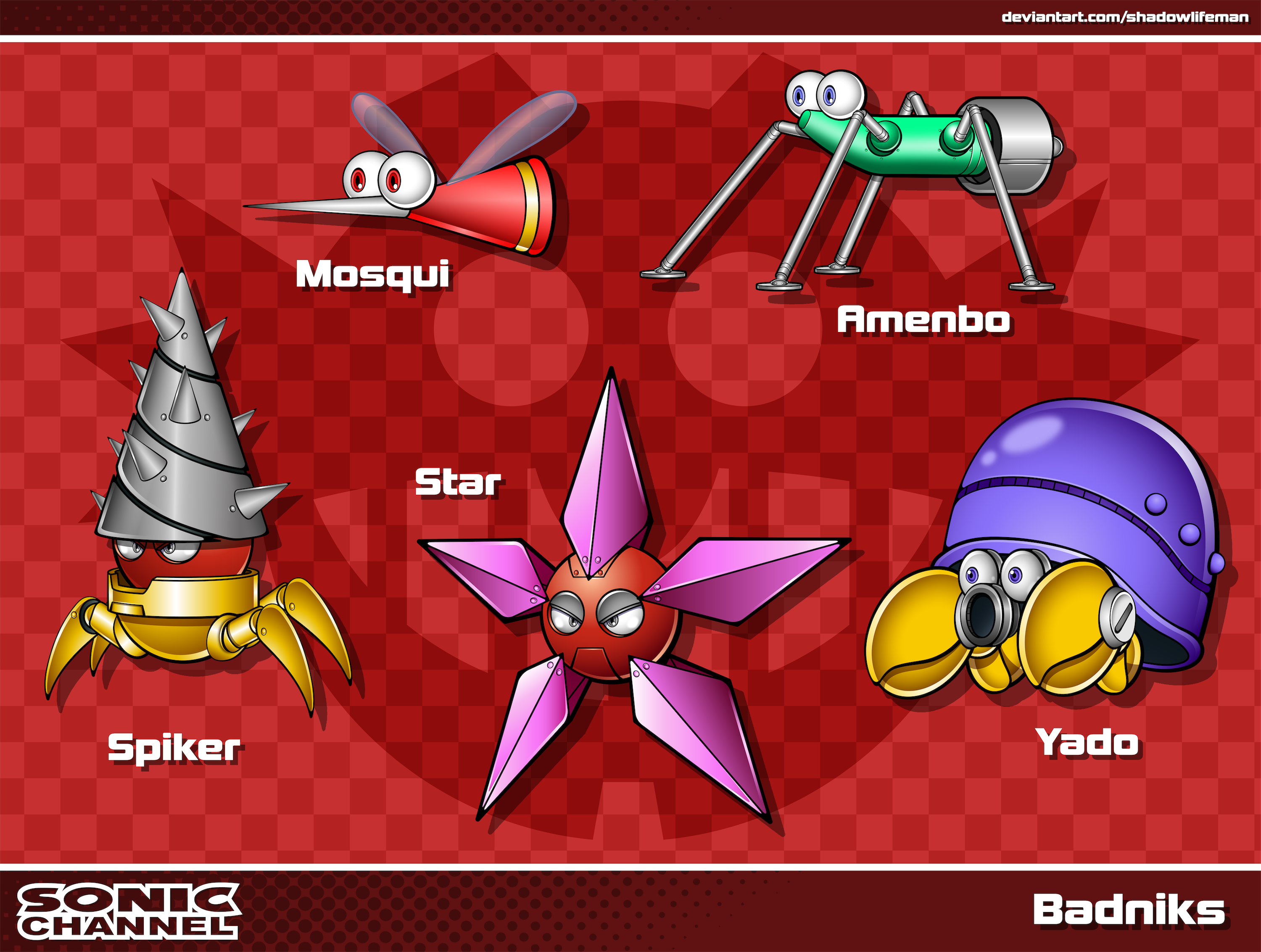 safe36284 artist:shadowlifeman33 2021813 agender250 agender only22 amenbo1 badnik96 character name974 checkered background118 eggman empire logo40 group1310 looking offscreen4196 mosqui1 robot983 sonic channel style14 spiker3 star (badnik)1 style emulation198 text607 yado1