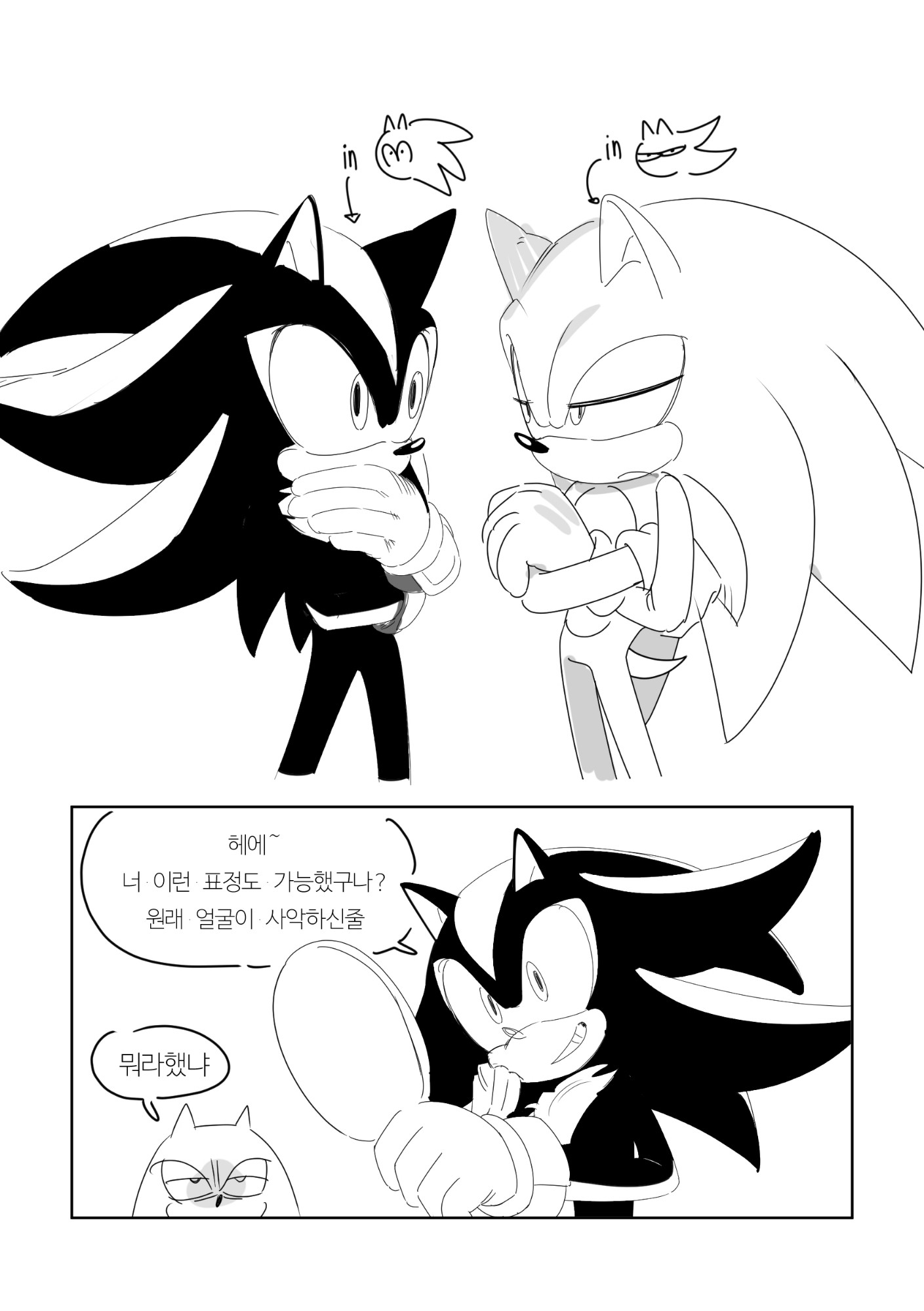 safe36297 artist:guitar_00000001152 shadow the hedgehog5973 sonic the hedgehog13081 20253231 arms folded593 body swap5 comic672 duo11814 frown4499 greyscale817 holding something3247 korean text216 looking at each other2598 looking at them2008 mirror24 monochrome2016 simple background14746 smile13537 speech bubble1334 standing10378 white background7161