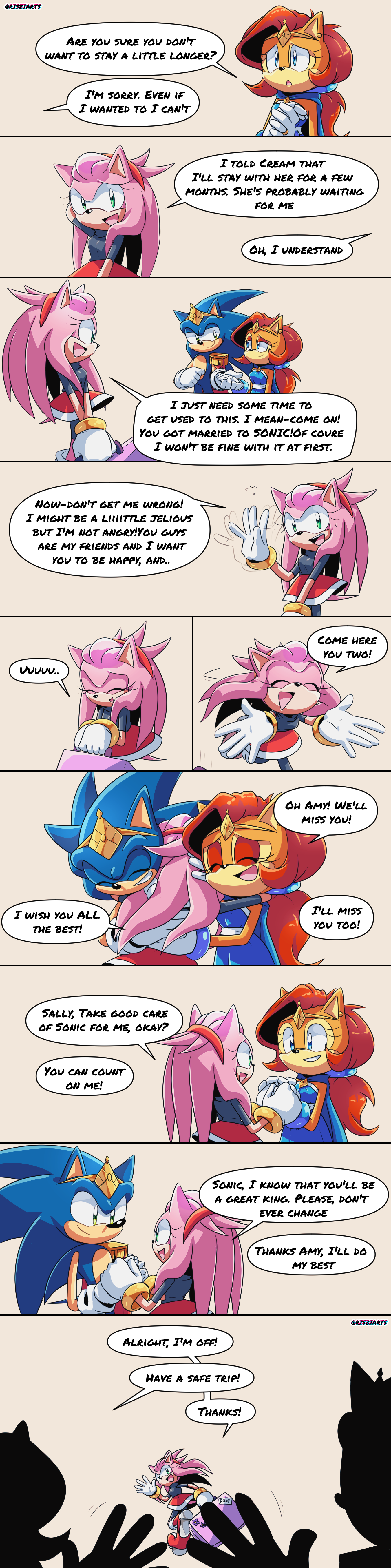 safe36392 artist:risziarts123 amy rose5667 sally acorn1247 sonic the hedgehog13134 chipmunk613 hedgehog7257 20232532 bag146 comic690 english text4151 female6030 hugging1200 king sonic31 male6323 queen sally acorn21 running595 sally x sonic305 shipping9618 simple background14809 speech bubble1351 straight1332 trio1707 waving332