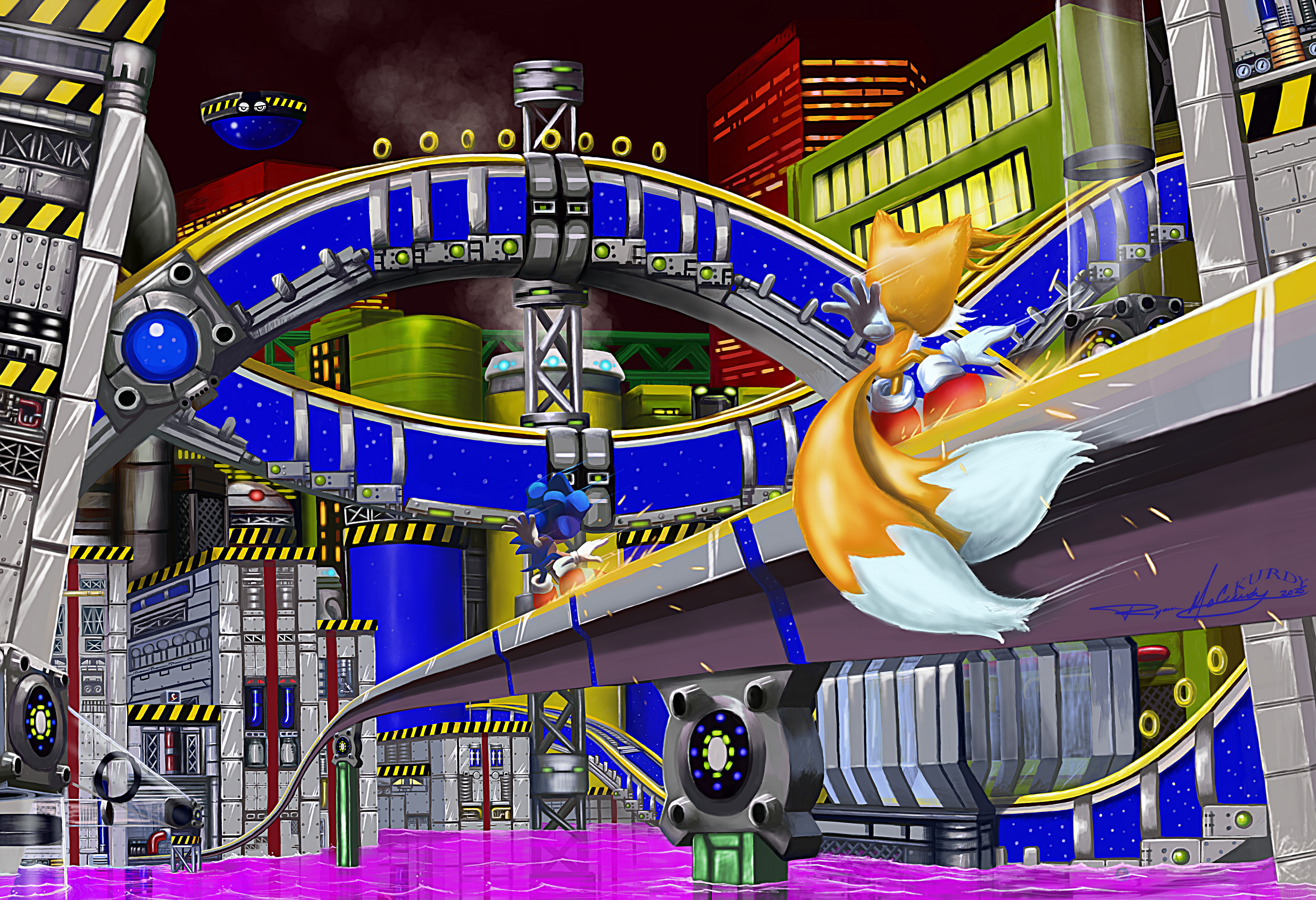 safe36558 artist:lkurdyl4 miles "tails" prower9049 sonic the hedgehog13235 fox2562 hedgehog7329 sonic the hedgehog 2121 20253352 abstract background6962 absurd res50 chemical plant17 cityscape69 duo11947 duo male406 floating platform2 from behind198 male6412 males only1213 pink water3 pipe5 rail grinding38 railing25 ring552 steam13 water442