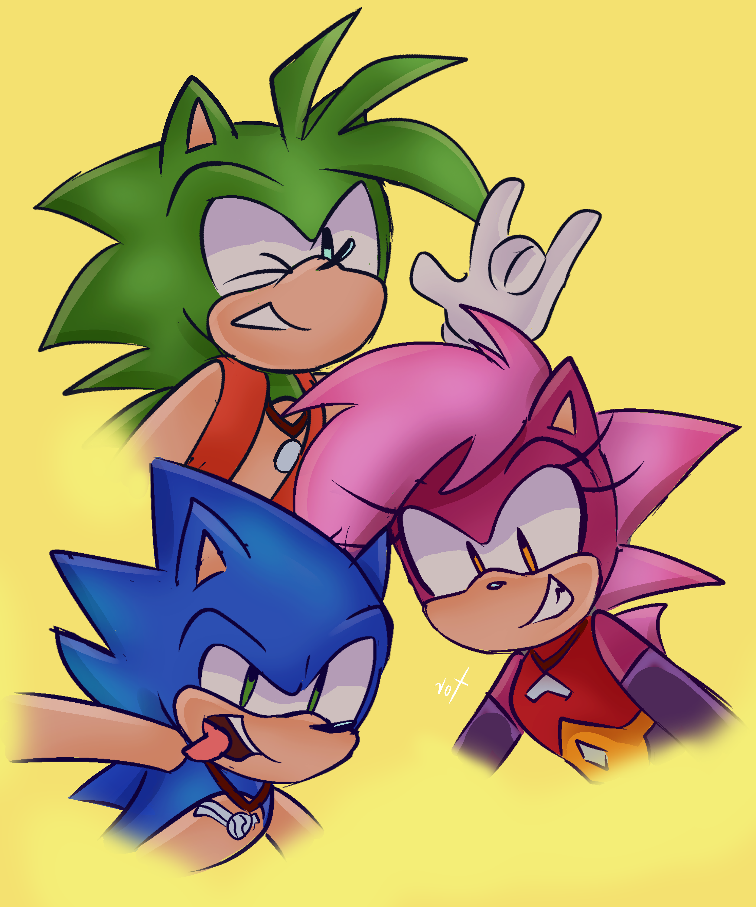 safe36558 artist:toronchelo1 sonia the hedgehog108 sonic the hedgehog13235 hedgehog7329 sonic underground65 202659 clenched teeth1846 clothes1610 devil horns (gesture)105 eyelashes1076 female6070 gilet19 looking at viewer7933 male6412 manic the hedgehog121 mouth open5488 necklace147 siblings83 simple background14888 smile13650 smiling at viewer858 tongue out800 trio1721 wink1125 yellow background332