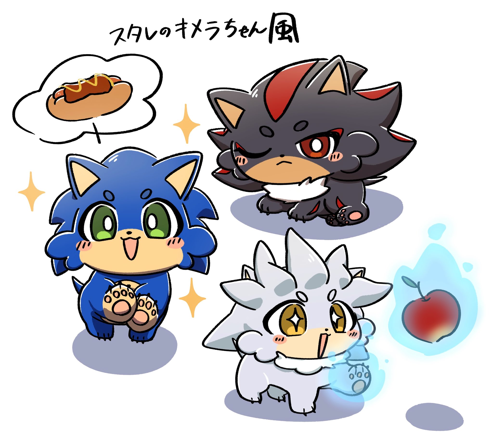 safe36577 artist:oudooooon42748 shadow the hedgehog6071 silver the hedgehog1868 sonic the hedgehog13246 20253353 animalified67 apple39 blushing6457 chili dog136 food415 japanese text395 literal animal232 mouth open5496 one eye closed730 pawpads248 psychokinesis133 simple background14899 smile13661 trio1722 white background7272