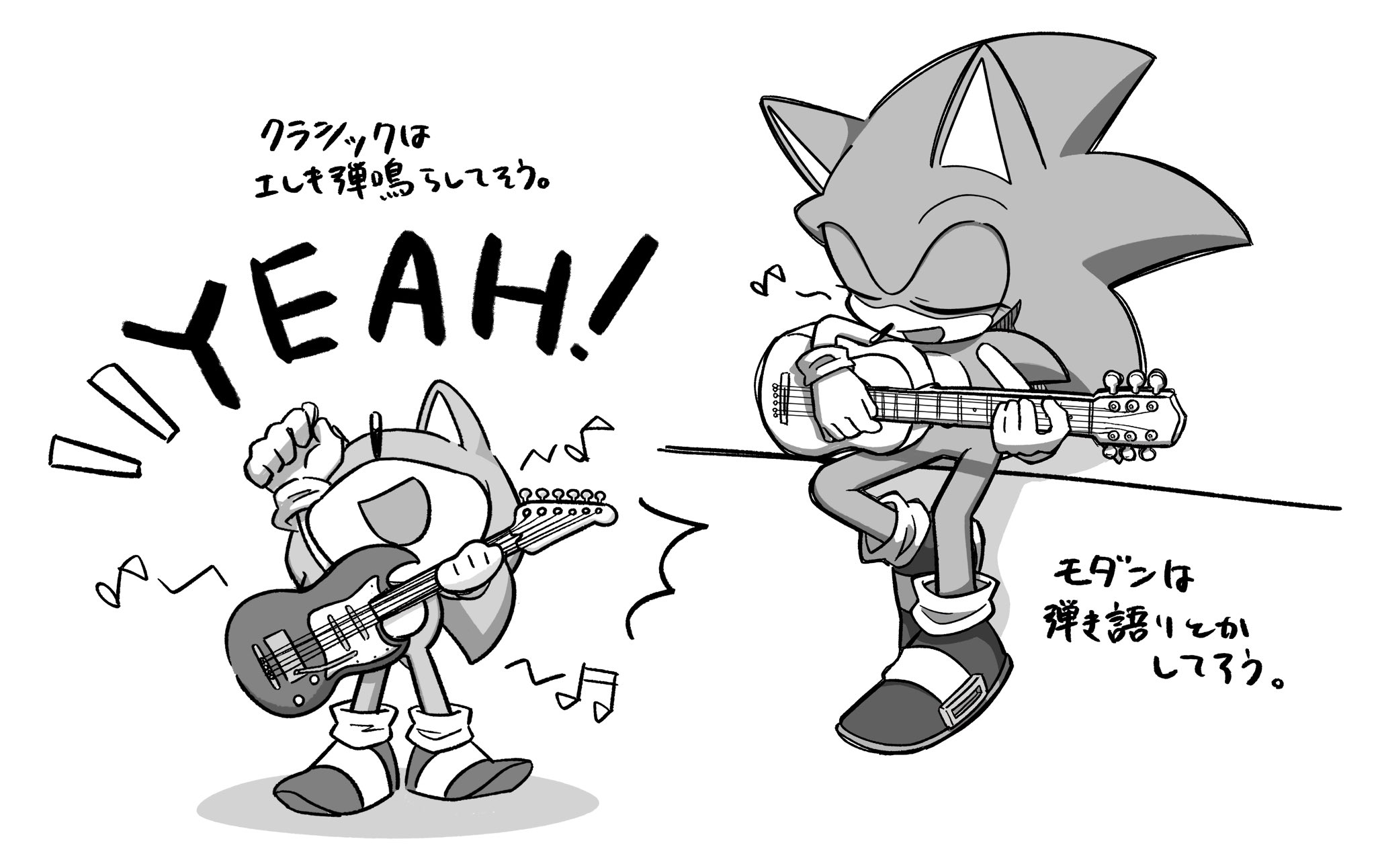 safe36577 artist:oudooooon42748 sonic the hedgehog13246 20253353 arm up38 eyes closed4585 greyscale868 guitar74 holding something3296 japanese text395 monochrome2075 mouth open5496 playing music15 simple background14899 singing71 sitting2195 smile13661 solo16702 standing10469 white background7272