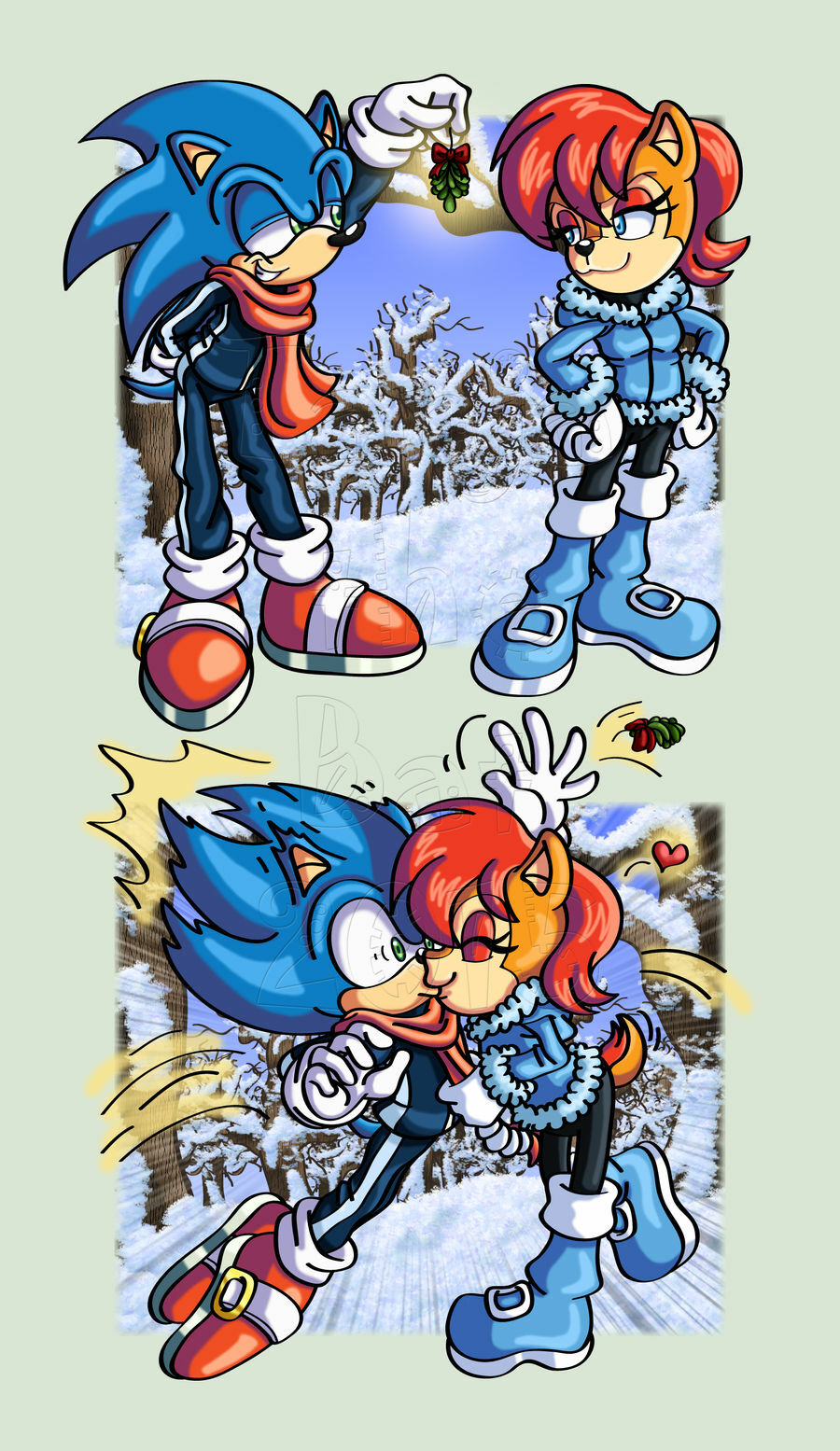safe36652 artist:bellseashell17 sally acorn1259 sonic the hedgehog13291 chipmunk626 hedgehog7344 2015285 christmas194 clothes1615 duo12001 female6083 forest108 fully clothed187 heart3155 holding something3315 kiss1038 male6437 pulling6 sally x sonic315 scarf525 shipping9683 snow164 straight1366 watermark495 winter96 winter outfit124