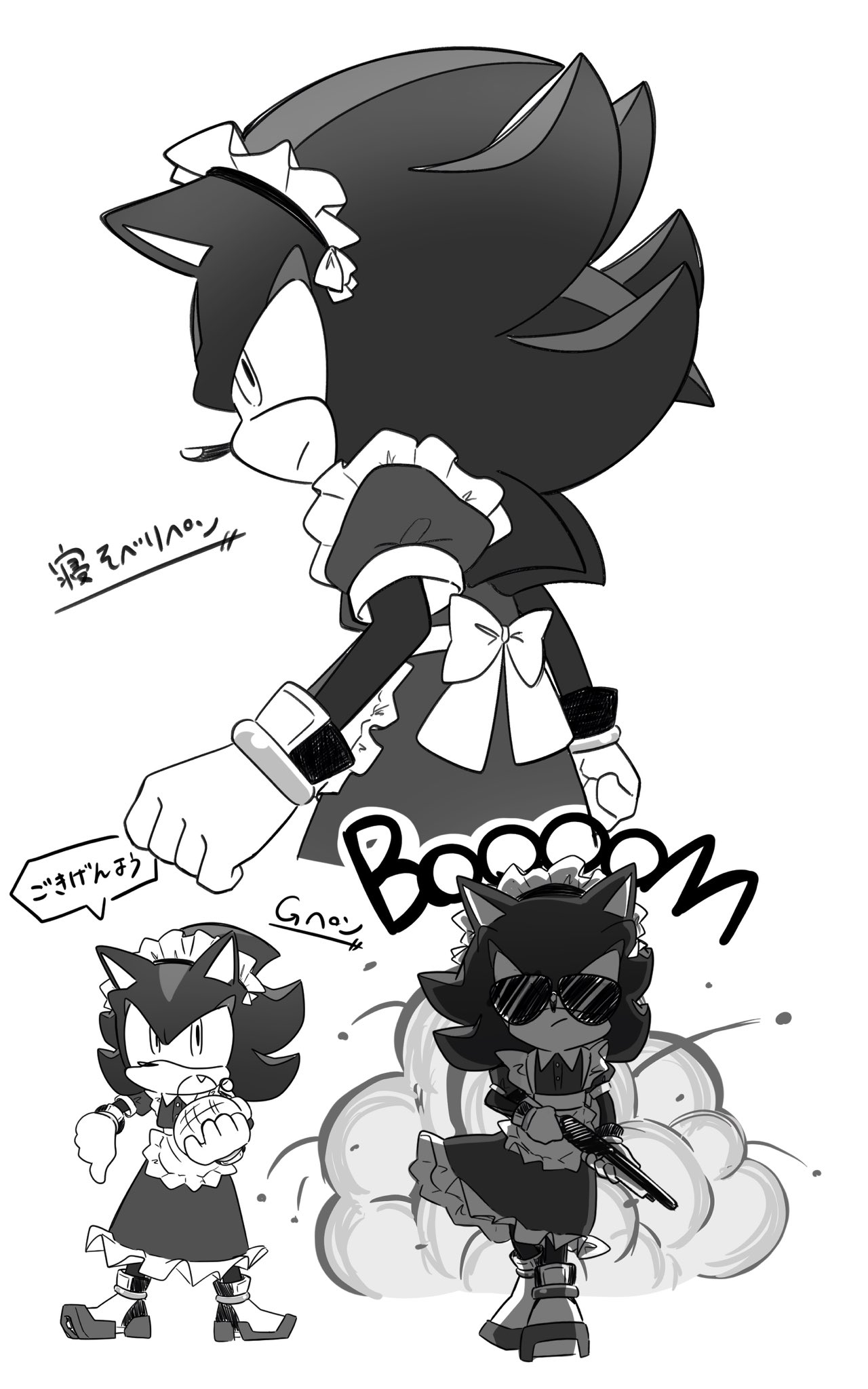 safe36769 artist:oudooooon42795 shadow the hedgehog6112 hedgehog7373 20253423 clothes1634 crossdressing155 dress759 explosion52 food430 fully clothed192 greyscale889 gun320 holding something3346 japanese text421 maid outfit39 male6467 monochrome2103 shotgun1 simple background14994 solo16784 speech bubble1365 standing10547 weapon111 white background7337