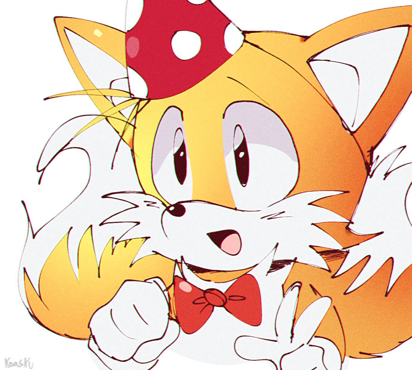 safe36959 artist:koasku21 miles "tails" prower9166 20221423 bowtie116 classic tails588 clenched fist691 cute5639 hat428 looking offscreen4268 mouth open5594 open smile850 party hat24 simple background15114 smile13841 solo16877 tailabetes1018 v sign1042 white background7387