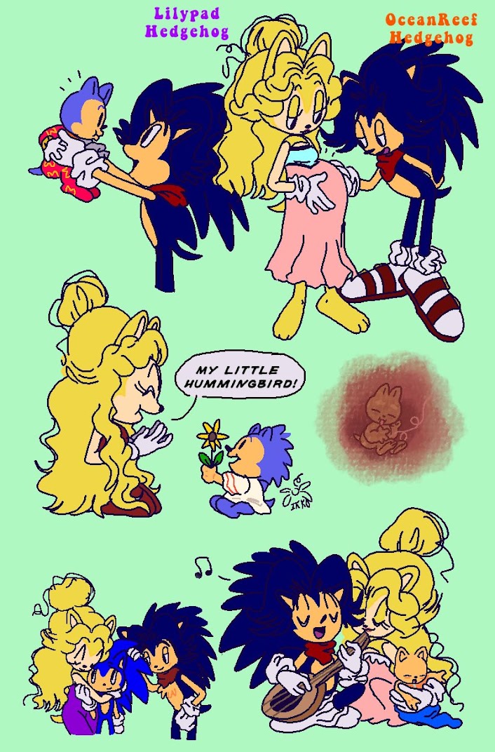 safe37197 artist:ikkomaruluv7 sonic the hedgehog13589 oc2534 oc:lilypad hedgehog1 oc:oceanreef hedgehog1 20253595 aged down109 baby130 child395 family75 flower636 green background267 hand on another's head162 parent and child14 playing music16 pregnant24 simple background15258 trio1768