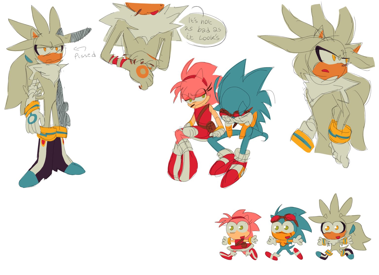 safe37246 artist:funnybonesfunny16 amy rose5767 silver the hedgehog1901 sonic the hedgehog13615 20253620 alternate hairstyle91 alternate universe860 au:dr. prower14 goggles on head354 hands on own face45 injured209 ponytail140 simple background15294 sitting2281 smile13993 speech bubble1443 trio1773 white background7503