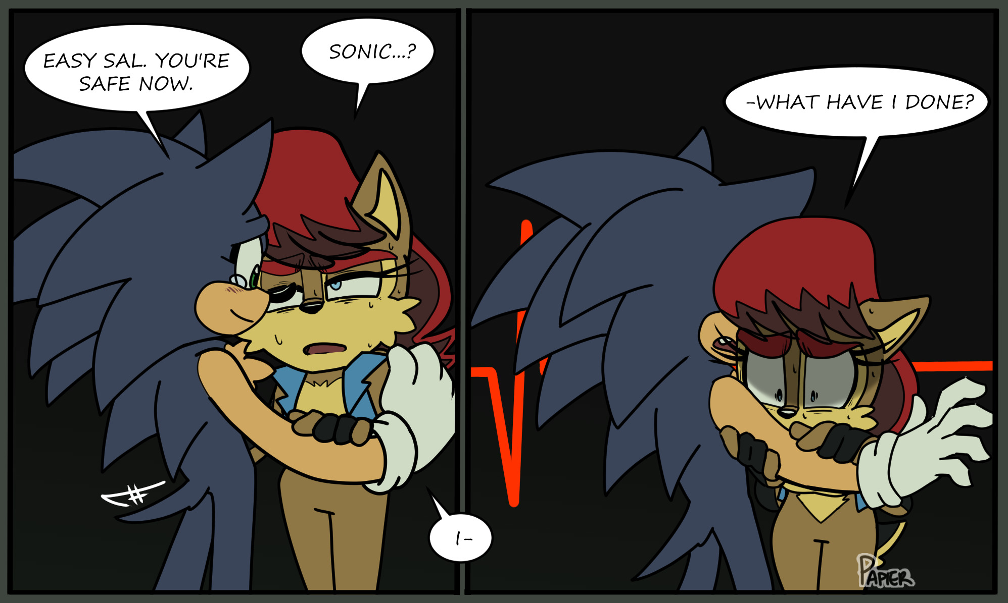 safe37853 artist:tracingpapier10 sally acorn1355 sonic the hedgehog13838 chipmunk720 hedgehog7599 20232625 alternate universe883 comic811 deroboticized7 duo12587 english text4355 female6433 guilt2 holding arm57 male6806 sally x sonic381 sally's vest and boots195 shipping10045 speech bubble1536 straight1550 tears520 tears of happiness54