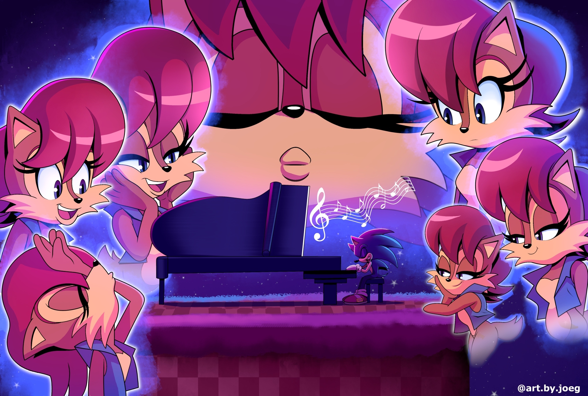 safe37899 artist:art-by-joeg021 sally acorn1377 sonic the hedgehog13861 chipmunk744 hedgehog7624 green hill zone173 2026290 duo12621 female6545 looking at them2234 male6860 musical notes73 piano11 playing music18 sally x sonic395 sally's vest and boots200 shipping10063 star (sky)471 straight1568