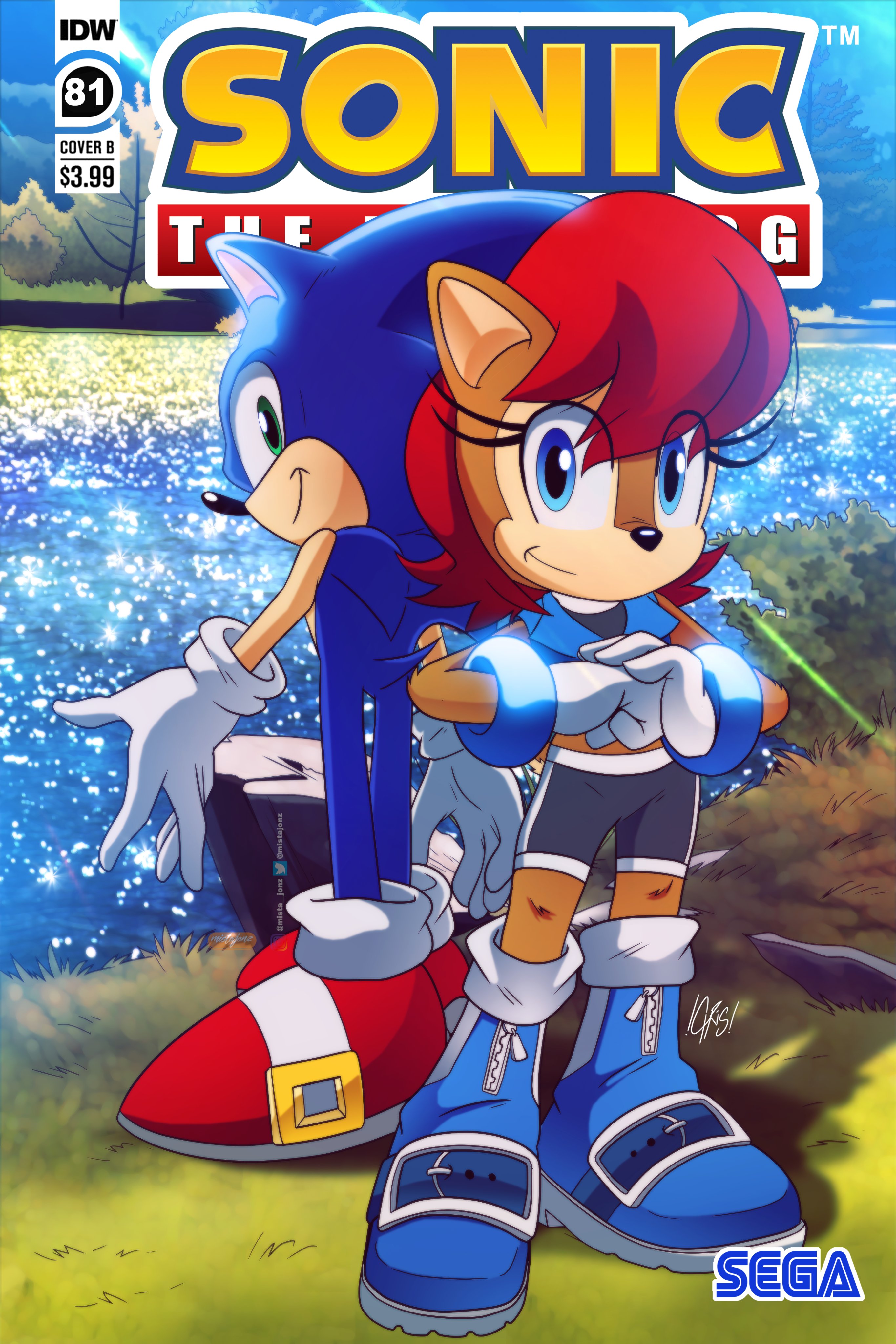 safe38299 artist:mistajonz8 sally acorn1460 sonic the hedgehog14056 chipmunk829 hedgehog7731 20221479 alternate version690 cover art57 duo12830 english text4437 eye clipping through hair460 fan cover art2 female6735 grass788 looking at viewer8468 male6992 nature3 outdoors1680 pose128 sally's ringblader outfit262 sega logo70 sonic the hedgehog (idw)14 text747 water486