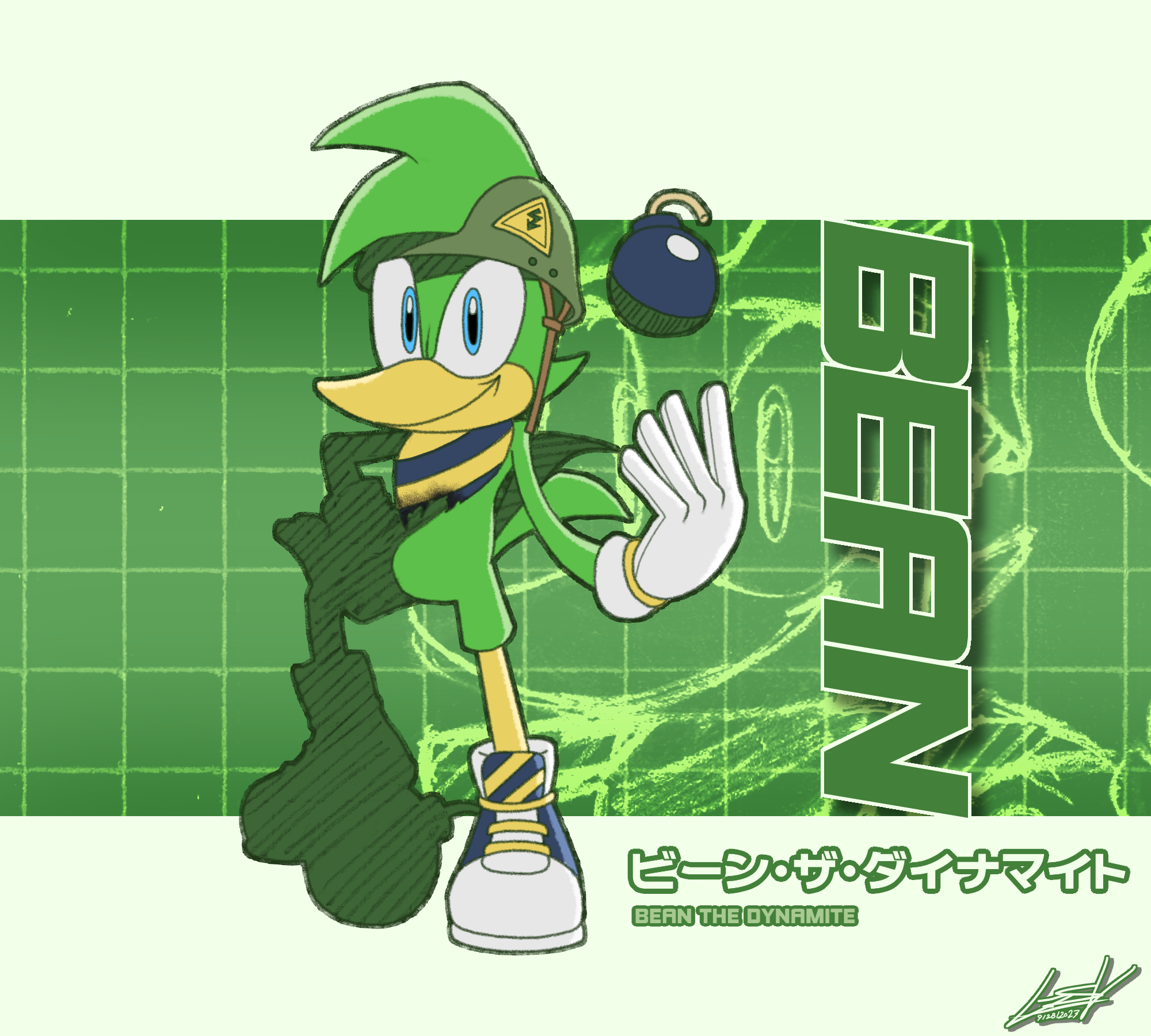 safe38733 artist:gsvproductions5 bean the dynamite80 bird426 20232690 abstract background7225 bandana311 bomb62 character name1098 english text4514 hand on hip1036 helmet37 japanese text508 looking at viewer8676 riders style95 signature6258 smile14835 solo17722 sonic riders374 style emulation260 text841