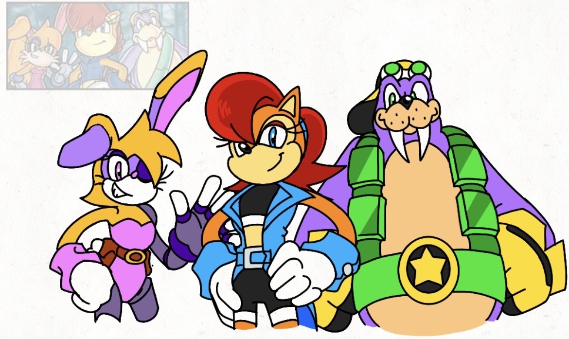 safe38912 artist:calebartboy1516 bunnie rabbot332 rotor walrus90 sally acorn1584 20254130 belt445 clothes1899 eyelashes1223 fur markings251 gilet26 goggles860 goggles on head386 hand on hip1045 hands on hips218 hat478 redraw1412 reference inset547 simple background16315 smile14939 standing11343 trio1884 waving361 white background8027 wink1202