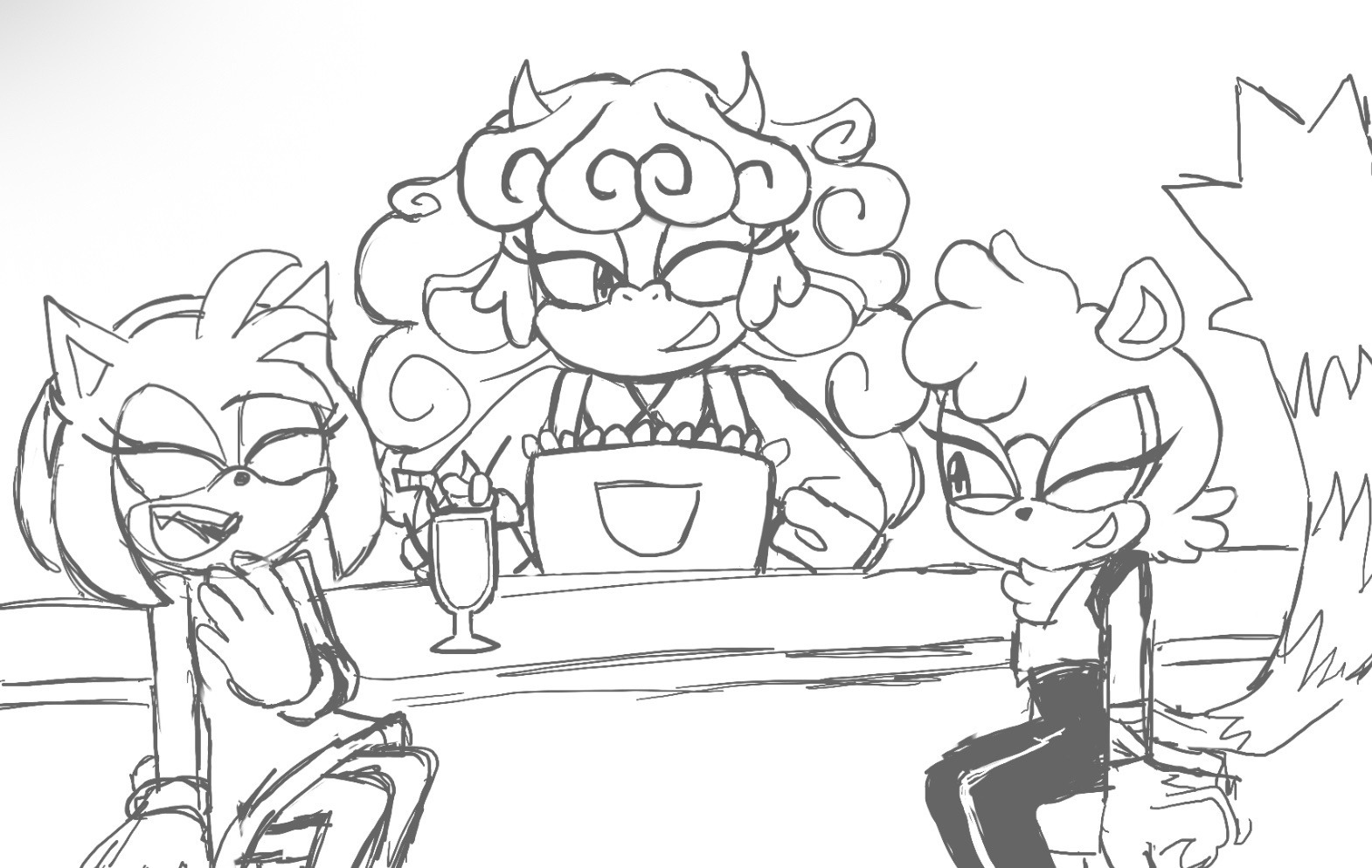 safe39127 artist:lunaliart9 amy rose5990 tangle the lemur1150 oc2656 oc:becky "moo" meadow1 20254181 bar4 cow8 drink155 grey background2569 line art1664 milkshake18 monochrome2405 mouth open6286 open smile1212 simple background16540 sitting2547 smile15218 trio1910 wink1217