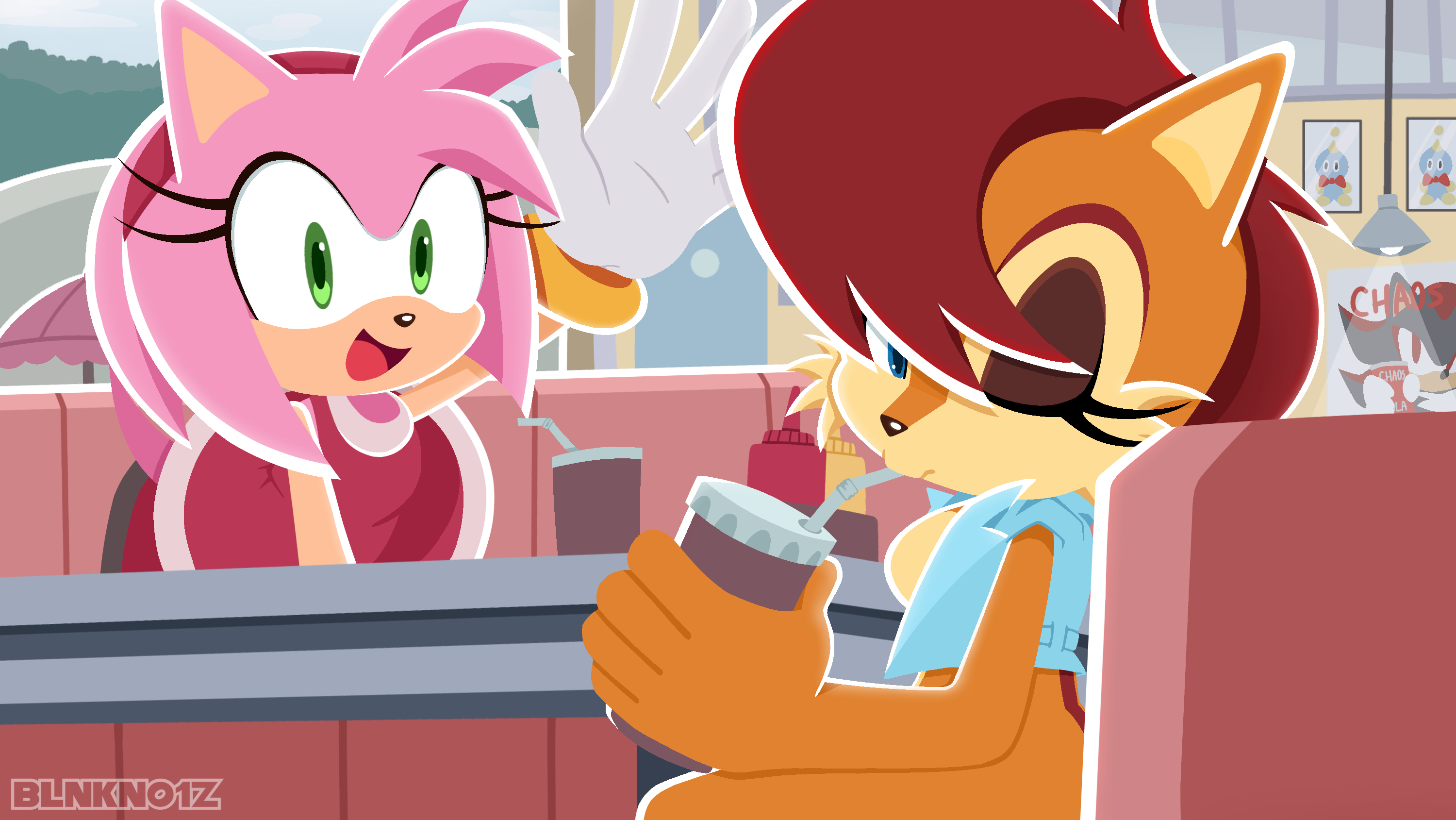 safe39168 artist:pensforpenc1ls8 amy rose5997 sally acorn1637 shadow the hedgehog6667 chao792 chipmunk1017 hedgehog8009 2026657 advertisement1 daytime1042 drink157 duo13381 female7092 holding something3981 looking at viewer8927 restaurant6 sally's vest and boots284 soda26 waving365