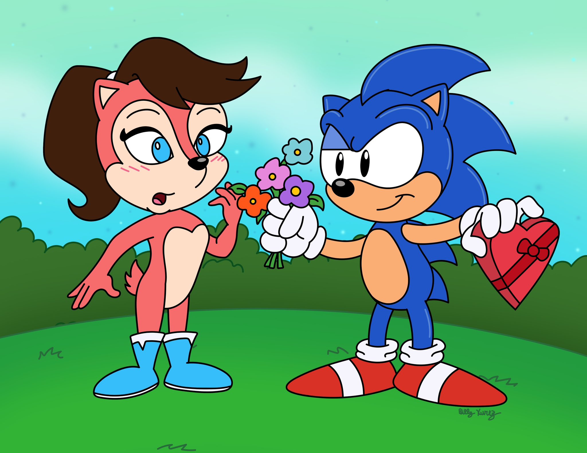 safe39328 artist:slysonic20 sally acorn1693 sonic the hedgehog14513 chipmunk1071 hedgehog8081 2026697 blushing7050 bush52 classic sally18 classic sonic1050 daytime1055 duo13466 female7173 flower707 heart shape box1 holding something4013 male7287 sally x sonic592 shipping10652 sonic satam46 straight1926 valentine's day166