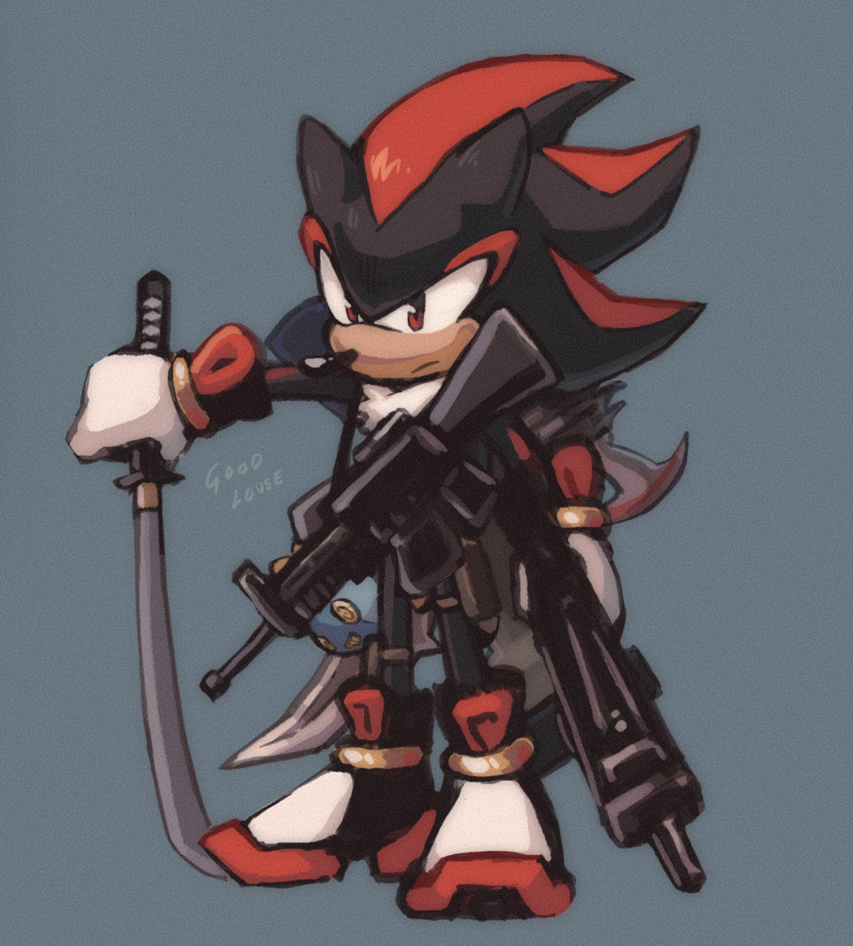 safe39664 artist:goodlouse2 shadow the hedgehog6753 hedgehog8306 20254257 blue background750 frown5061 gun366 holding something4075 katana19 looking offscreen4759 male7555 omochao gun2 rifle4 shadow the hedgehog (video game)149 signature6429 simple background16858 solo18332 weapon216