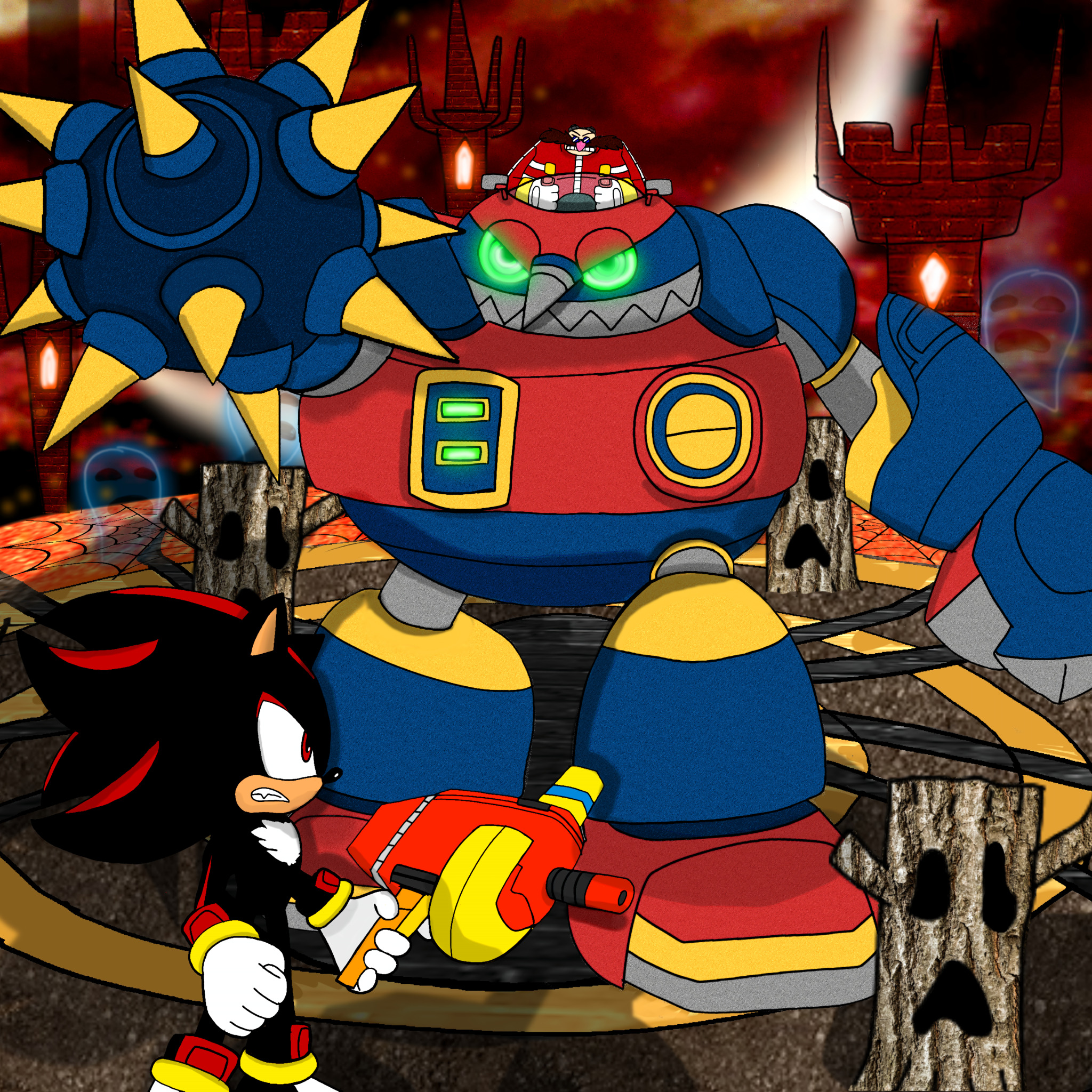 safe39674 artist:egg-emperor1 robotnik764 shadow the hedgehog6753 human2274 20254259 abstract background7413 blaster29 clenched teeth2018 cryptic castle4 duo13620 egg breaker2 fight172 glowing eyes515 holding something4075 looking at each other2981 male7556 mechsuit3 red sky26 robot1144 shadow the hedgehog (video game)149 standing11641 weapon216