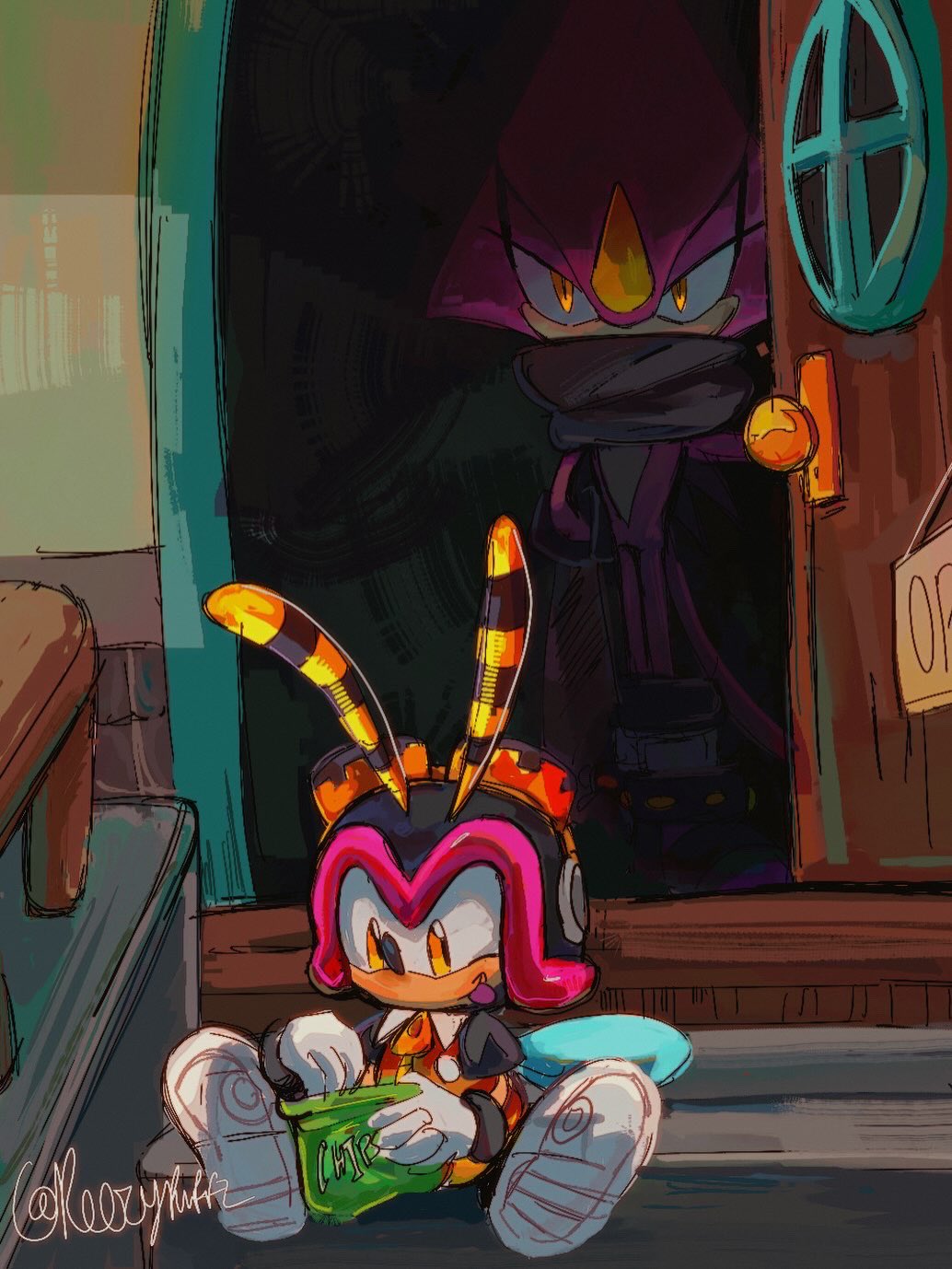 safe39789 artist:reezypuffz2 charmy bee492 espio the chameleon837 bee202 2026870 chameleon228 door29 doorway15 duo13682 food560 frown5096 holding something4120 house29 indoors457 lidded eyes4454 male7630 outdoors1880 potato chips2 scarf619 signature6450 sitting2635 smile15677 standing11684 tongue out935 treads323