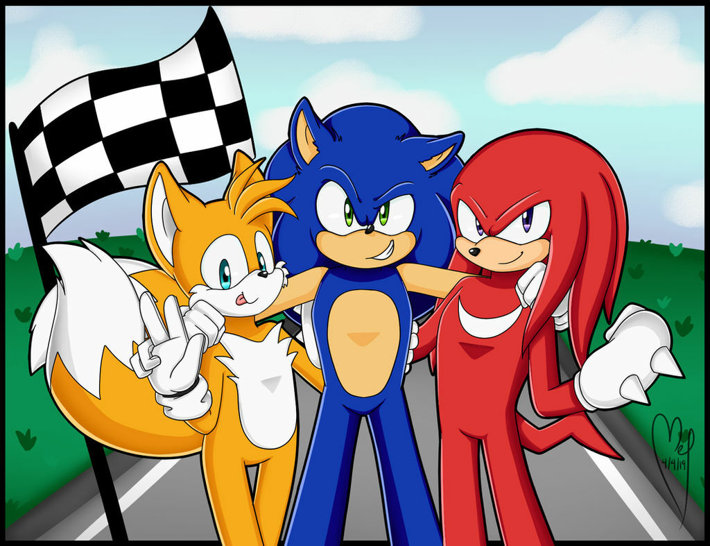 safe40461 artist:melancholybat9 knuckles the echidna2476 miles "tails" prower9852 sonic the hedgehog14966 2019812 abstract background7595 arm around shoulders306 checkered flag6 clouds1091 daytime1203 flag499 grass915 looking at viewer9550 outdoors1961 smile16228 standing11955 team sonic406 tongue out970 trio2016 v sign1187