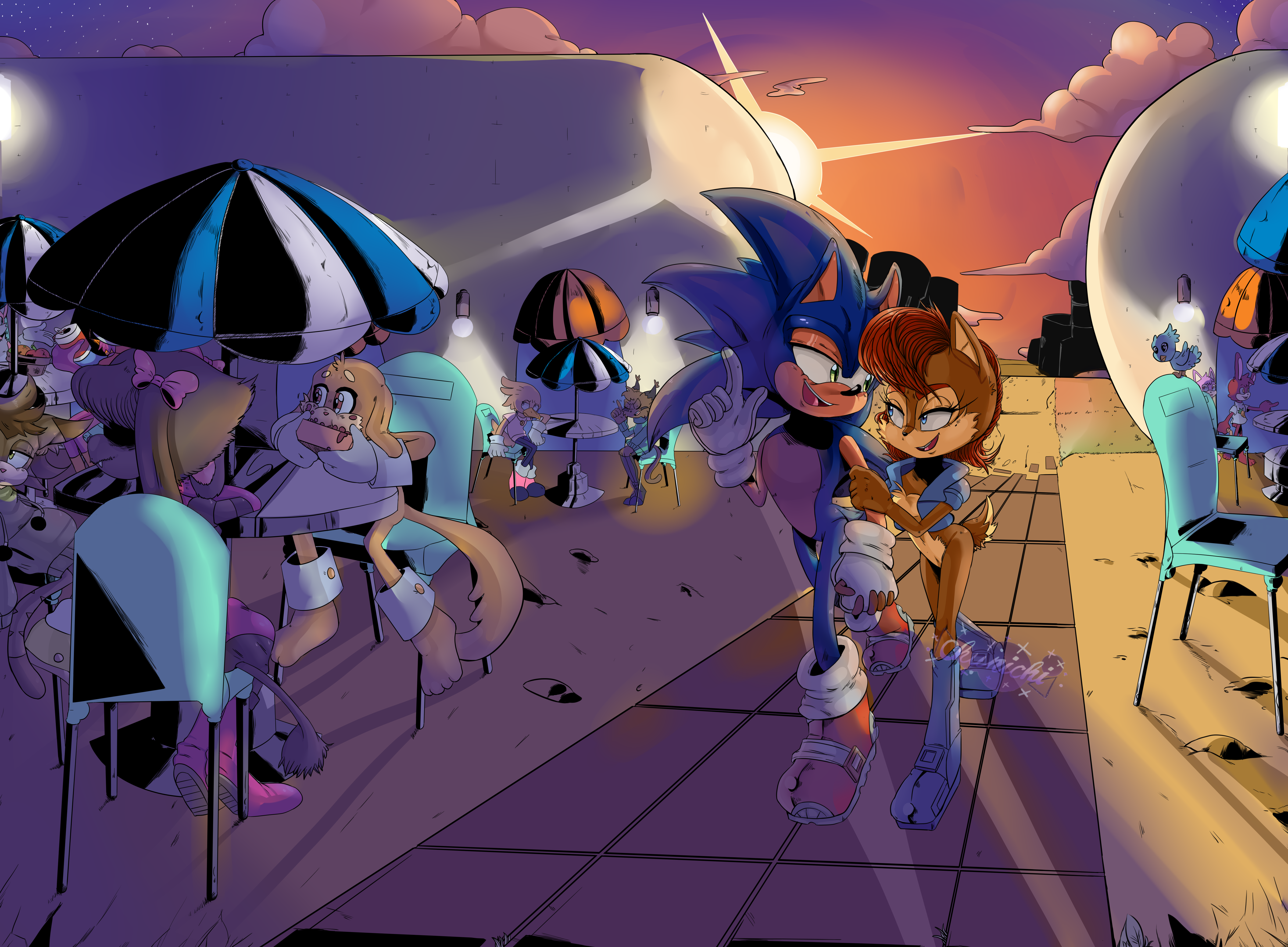 safe40601 artist:chunichichuni11 sally acorn1883 sonic the hedgehog15024 bird460 chipmunk1290 dog126 hedgehog8748 lynx182 rabbit735 20201097 afternoon6 building84 chair132 clothes2195 drink186 duo focus146 eating179 female7761 food585 fruit106 group1559 literal animal275 male8090 sally x sonic714 sally's vest and boots357 shadow (lighting)495 shipping11168 sitting2778 soda34 star (sky)565 straight2190 table173 umbrella82 unnamed character6 walking614