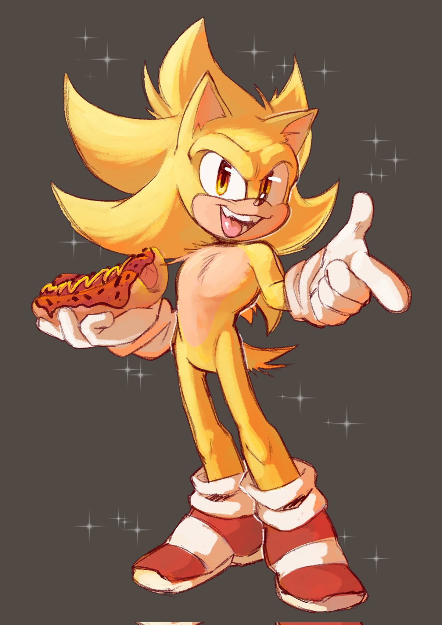 safe40779 artist:lebluenooki22 artist:marty_jade2332 sonic the hedgehog15123 super sonic643 hedgehog8802 20261197 chili dog169 food596 grey background2753 holding something4466 hot dog30 looking at viewer9818 male8209 mouth open6937 pointing1375 redraw1484 simple background17814 smile16577 solo19224 sparkles1143 standing12077 super form1081