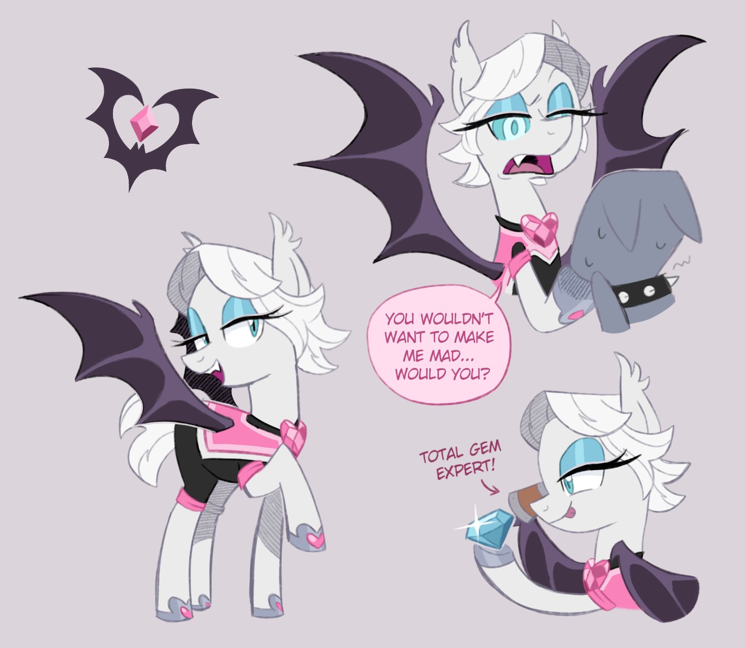 safe40935 artist:galaxylover0623 rouge the bat1941 bat pony3 dialogue3079 eyes on the prize16 gem66 grey background2759 holding something4515 hypnosis10 multeity2 my little pony245 open mouth244 open smile1629 ponified43 pony149 simple background17881 smile16664 solo19288 species swap273 tongue out1001