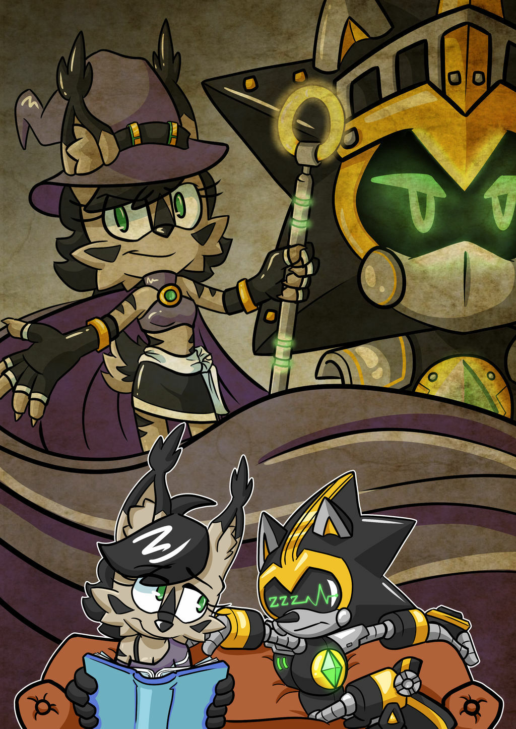 safe40935 artist:bohemianlizardking3 nicole the hololynx437 shard the metal105 lynx202 2018748 book136 duo14401 female8029 holding something4515 knight armor80 looking at them2559 looking at viewer9877 male8310 nicole x shard63 robot1195 shipping11328 sitting2841 sleeping481 sofa45 straight2303 witch outfit18 zzz124