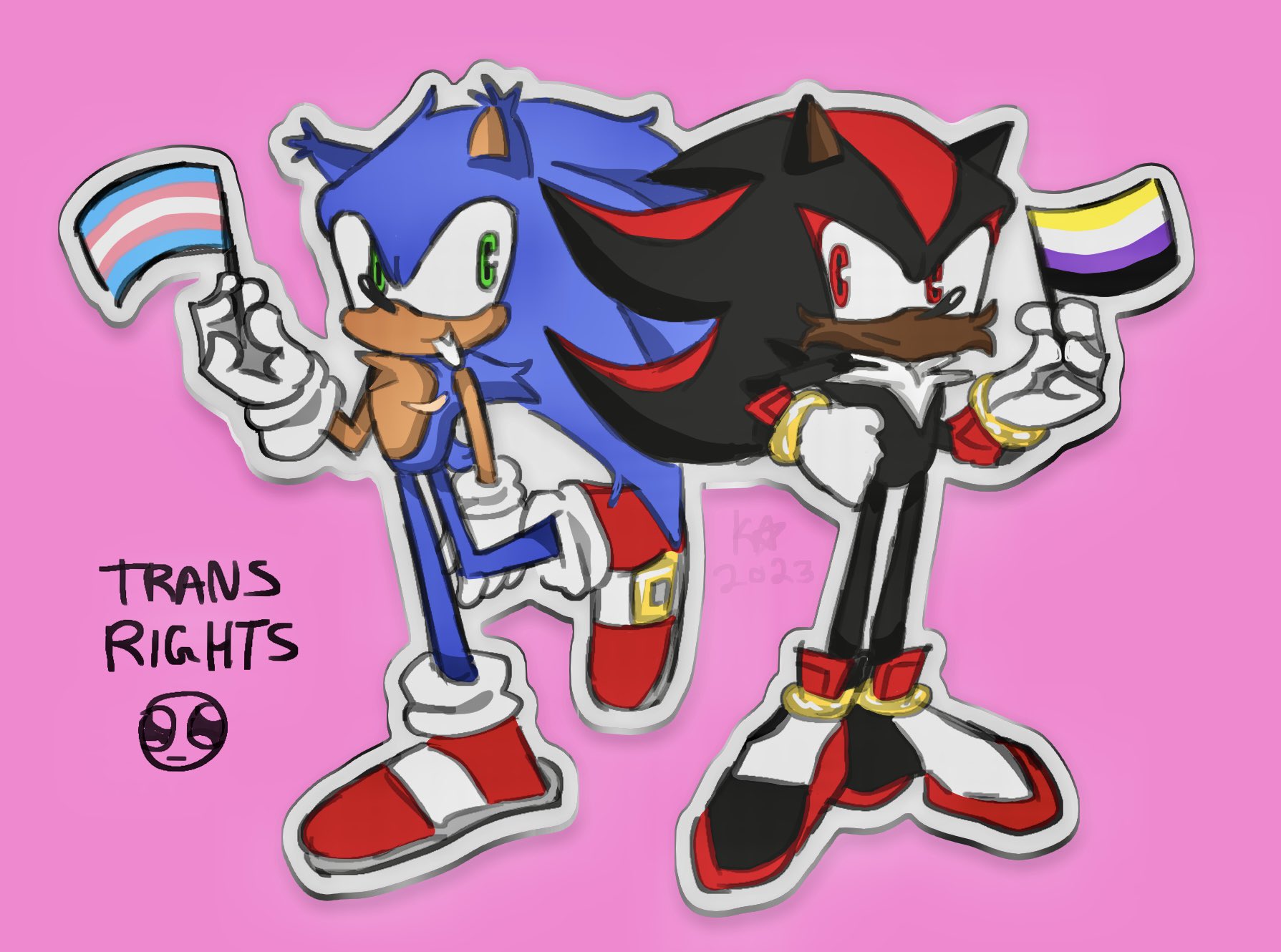 safe34684 artist:clowntagonist3 shadow the hedgehog5654 sonic the hedgehog12360 chest fluff700 duo11091 ear fluff649 english text3958 flag468 frown4264 holding something3018 looking at each other2464 nonbinary331 nonbinary pride198 outline1679 pink background435 simple background13769 smile12734 standing9814 top surgery scars648 trans male893 trans pride569 transgender1588